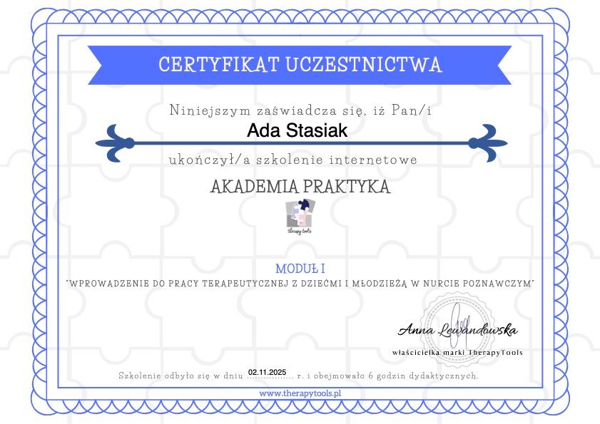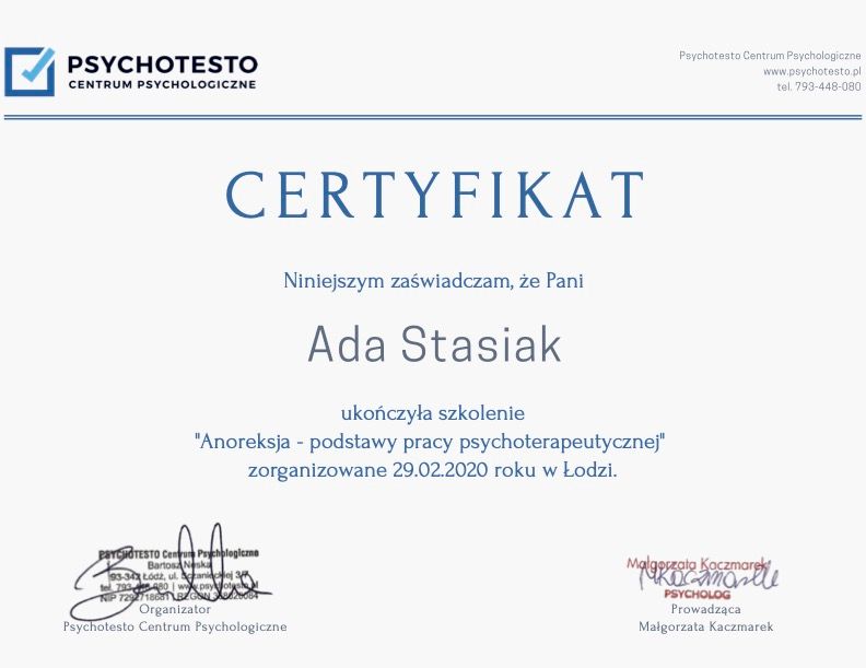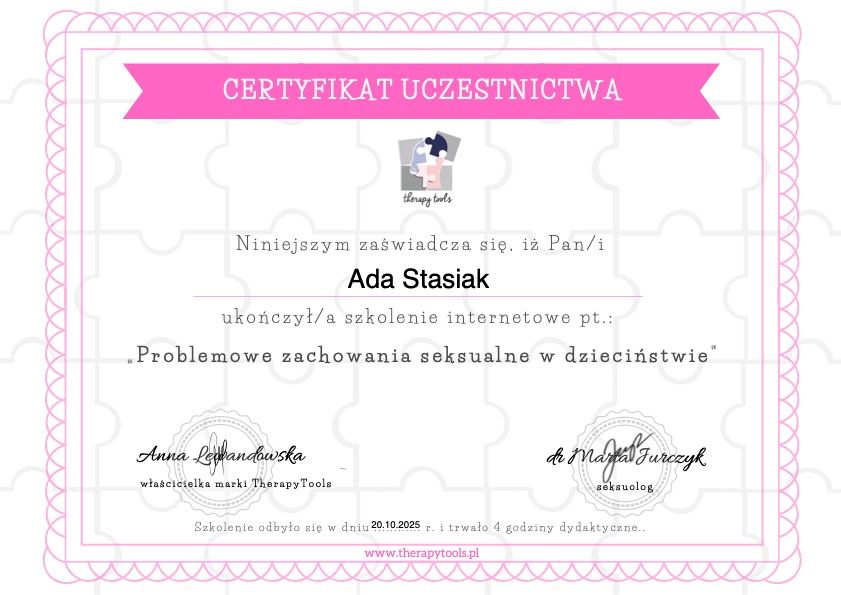 Pani Ada to niezwykle kompetentna, empatyczna i zaangażowana osoba. Wyrożnia się profesjonalnym podejściem oraz umiejętnością tworzenia bezpiecznej atmosfery. Z całego serca polecam Panią Adę, wszystkim, którzy szukają rzetelnego wsparcia