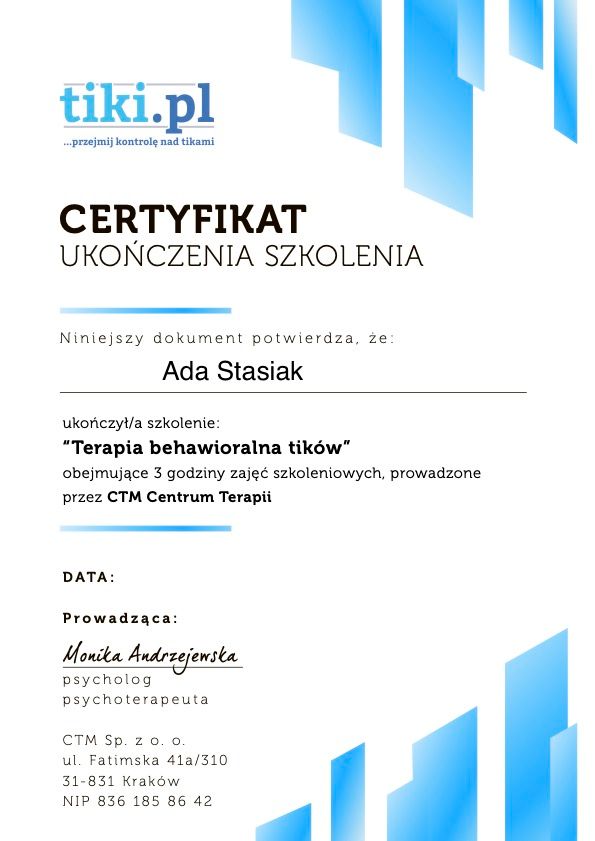 Pani Ada Stasiak ma świetne podejście do dzieci, potrafi je uważnie wysłuchać,a jednocześnie jasno i spokojnie przekazała nam wskazówki. Dzięki terapii widzimy postępy w zachowaniu i emocjach naszego dziecka. To specjalista któremu można zaufać. Polecam z całym przekonaniem.