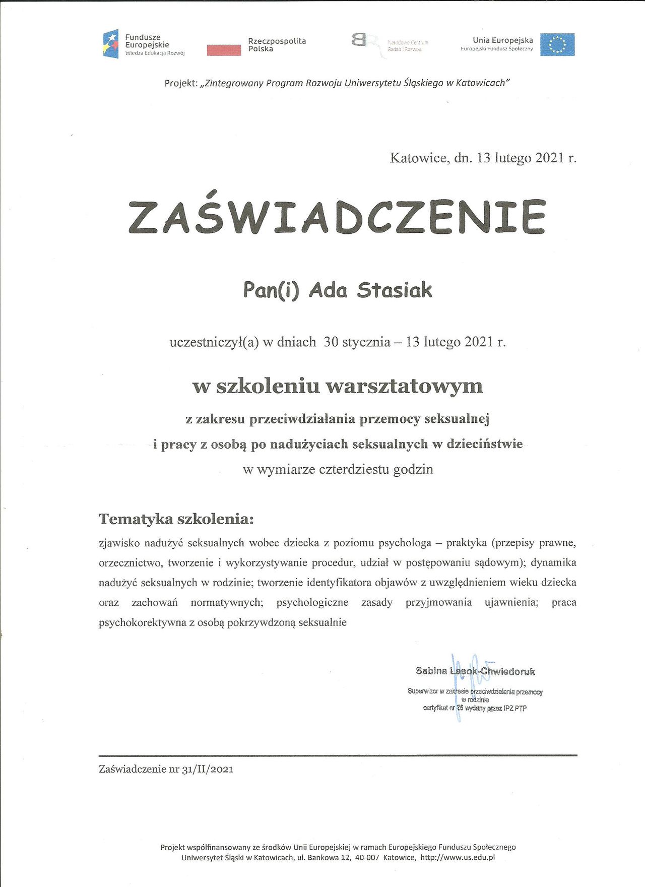 Jestem absolwentką Uniwersytetu Śląskiego na kierunku psychologia (specjalizacja psychologia kliniczna oraz psychologia zdrowia i jakości życia) oraz pedagogika specjalna. Dodatkowo ukończyłam także studia podyplomowe z zakresu diagnozy i terapii zaburzeń integracji sensorycznej. Nieustannie odbywam nowe szkolenia - między innymi z obszaru zaburzeń lękowych, problemowych zachowań seksualnych u dzieci, nadwrażliwości słuchowych, mutyzmu wybiórczego, pracy systemowej z rodziną.