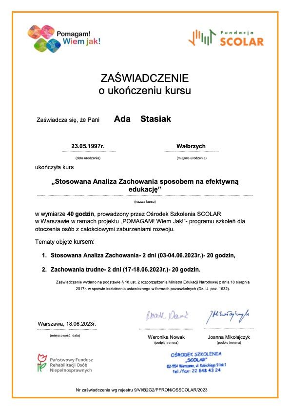 Z Panią Adą miałam okazję pracować przez 2 lata w przedszkolu. Jest świetną specjalistką, która kocha to co robi. Stale sie dokształca,aby lepiej wykonywać swoją pracę. Dzięki współpracy z Panią Adą wiele się nauczyłam i poprawiłam swój warsztat pracy oraz stałam się lepszą mamą dla swojego synka. Dzieci uwielbiają pracę z Panią Adą, która pomogła wielu rodzinom. Z całego serca polecam współpracę z tak wybitnym psychologiem.