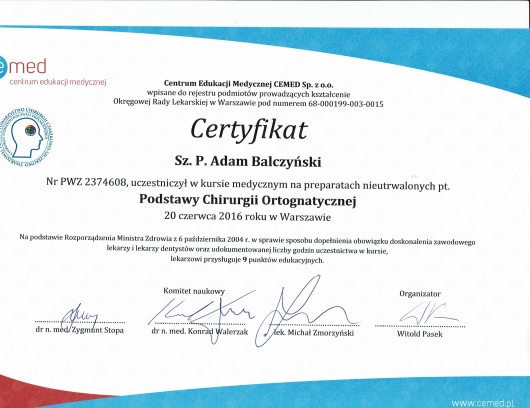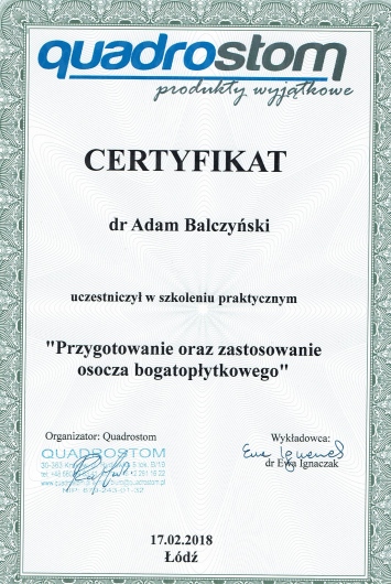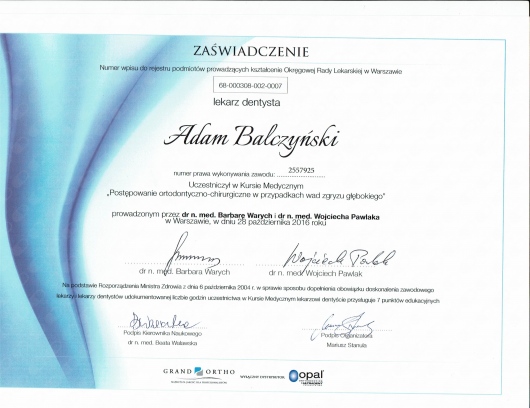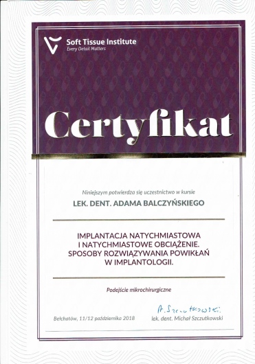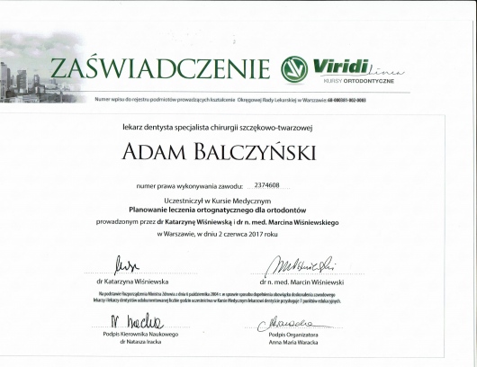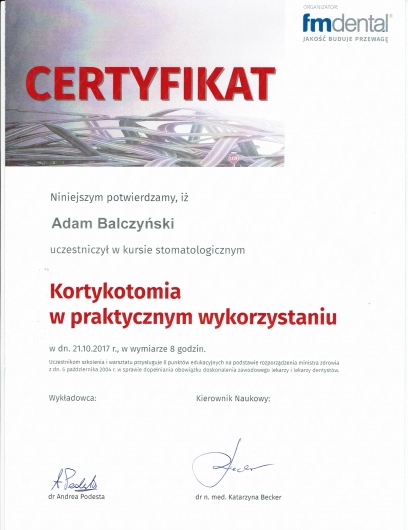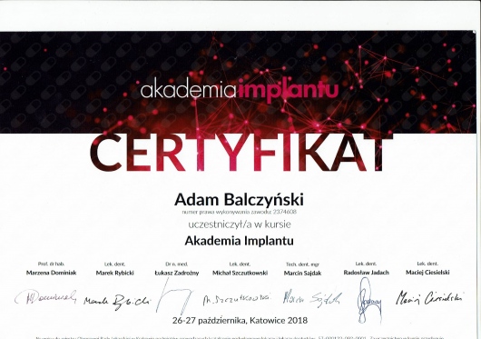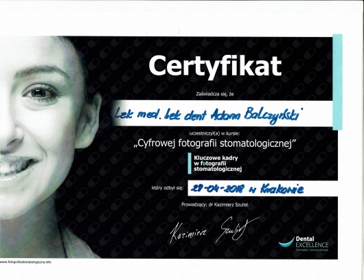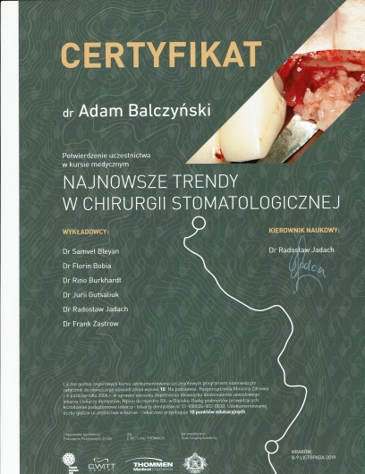Polecam Pana Doktora Adama Balczyńskiego - miałam przeprowadzany zabieg usunięcia 4 zatrzymanych ósemek w Scandinavian Clinic w Krakowie. Na pierwszej wizycie odbyłam konsultację z Panem Doktorem, na której zostałam poinformowana o zaleceniach przedzabiegowych, przebiegu całego zabiegu oraz kosztach, z racji tego, iż jestem spoza Krakowa zostałam zakwalifikowana do usunięcia 4 ósemek podczas jednej wizyty. Pan Doktor podczas konsultacji rozwiał cały mój mega stres dotyczący zabiegu poprzez rozmowę i rozwianie wszelkich moich wątpliwości. Na drugiej wizycie miałam przeprowadzony zabieg, który przebiegł pomyślnie, bez żadnych komplikacji, po zabiegu czułam się dobrze, wszystko się ładnie goiło, a co najważniejsze, nie miałam opuchlizny ani nie odczuwałam żadnego bólu.