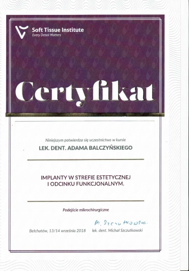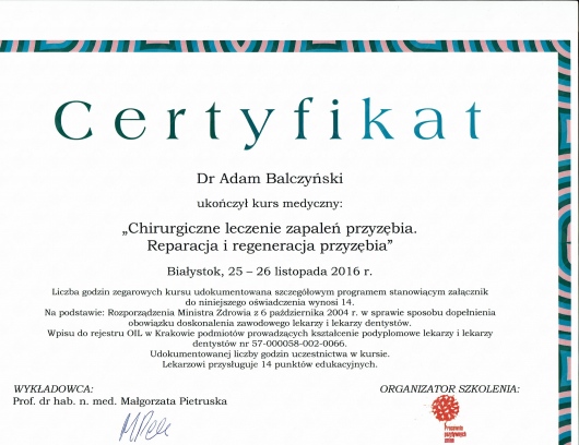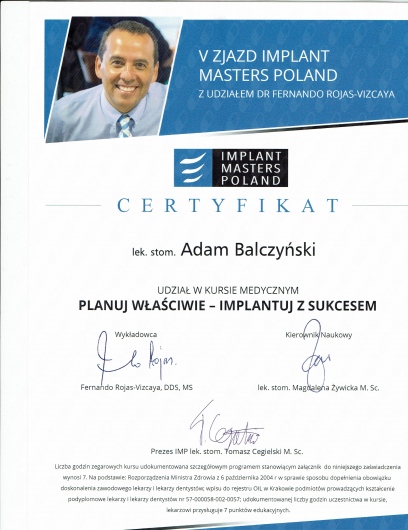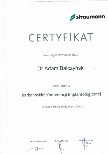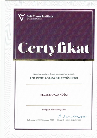 Do doktora Balczyńskiego trafiłem z ubytkiem 4 zębów. W trakcie leczenia doktor przeprowadził przeszczep kości, podniesienie zatoki oraz przeszczep dziąsła. W efekcie mam 3 implanty i jeden most na implantach. W trakcie wizyt cierpliwie tłumaczył co robi, tak aby było to zrozumiałe dla laika. Porównując stan "przed" i "po" mogę powiedzieć, że wynik jego pracy jest rewelacyjny. Żałuję jedynie, że nie zdecydowałem się na leczenie wcześniej. Świetny lekarz.
