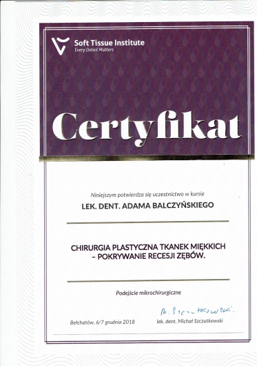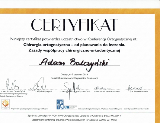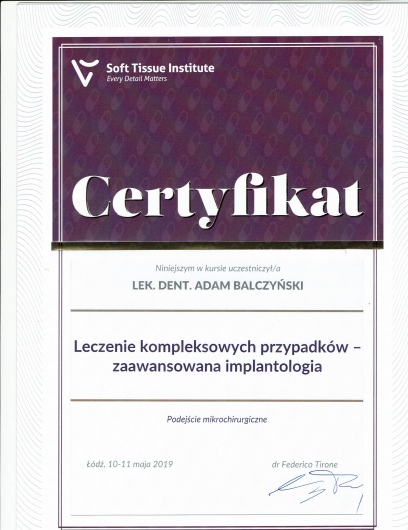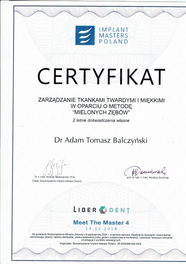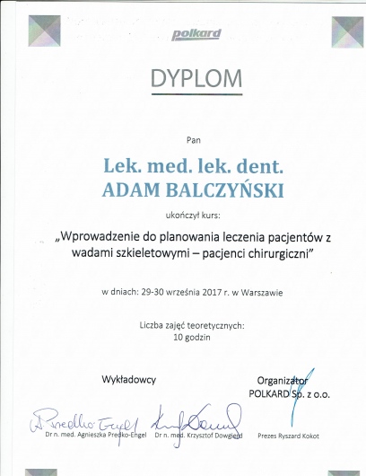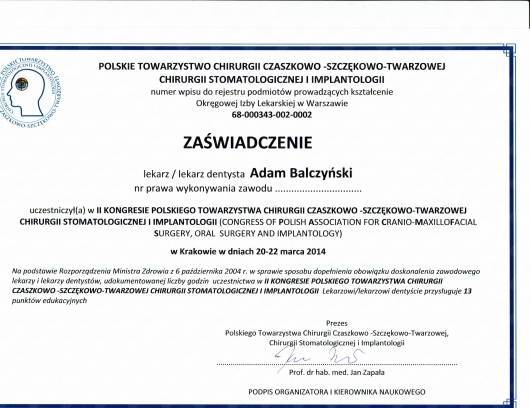 Jestem absolwentem Uniwersytetu Medycznego w Łodzi ( Wydział Lekarski 2007r i Lekarsko-dentystyczny 2010r ) Staż specjalizacyjny (2009r - 2015r) w zakresie Chirurgii szczękowo-twarzowej rozpocząłem w Oddziale Klinicznym Chirurgii Czaszkowo-Szczękowo-Twarzowej i Onkologicznej Uniwersyteckiego Szpitala Klinicznego nr 1 im. Norberta Barlickiego w Łodzi, a następnie kontynuowałem i ukończyłem w Oddziale Klinicznym Chirurgii Czaszkowo-Szczękowo-Twarzowej, Onkologicznej i Rekonstrukcyjnej IS CMUJ Szpitala Specjalistycznego im. Ludwika Rydygiera w Krakowie. Wykonuję głównie zabiegi z zakresu implantologii, chirurgii stomatologicznej, chirurgii periodontologicznej oraz ambulatoryjne zabiegi z zakresu chirurgii szczękowo-twarzowej. Bardzo ważne jest dla mnie połączenie wiedzy teoretycznej z praktyką oraz precyzją wykonywanych zabiegów chirurgicznych , dlatego często biorę udział w szkoleniach i kursach .