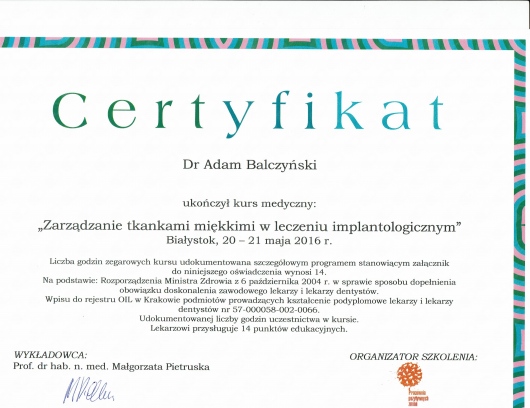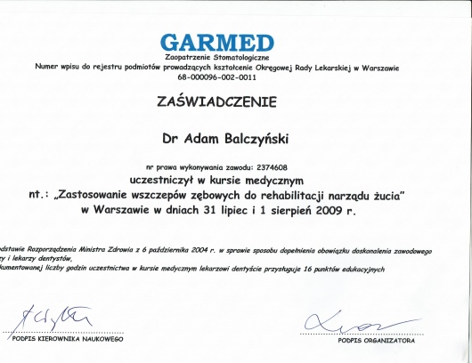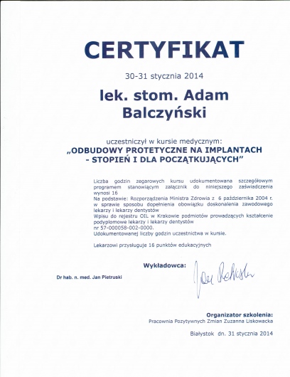 Z całego serca polecam dr Balczyńskiego, którego znalazłam właśnie na forach. Bardzo bałam się implantów, mam już 67 lat, obawiałam się powikłań. Już na pierwszej wizycie doktor wzbudził moje zaufanie. Jest bardzo konkretny, uważny, pewny tego, co mówi i robi. Jestem już po wstawieniu dwóch implantów. Jeden był szczególny, bo w miejscu jedynki górnej. Pojawiały się przetoki wokół korony, okazało się, że zęba nie da się już uratować. Doktor podczas jednej wizyty usunął ten ząb, wstawił implant, zbudował ząb tymczasowy oraz przeszczepił dziąsło. Po tych wszystkich zabiegach wyszłam o własnych siłach i mogłam normalnie egzystować. Nie miałam żadnych powikłań, być może jest to skutek wielkiej dbałości o sterylność w gabinecie. Uważam doktora za geniusza w dziedzinie implantologii. Na uwagę zasługuje jeszcze fakt, że ostateczna cena leczenia zawsze jest taka, jak była podana na początku leczenia. W wielu innych gabinetach wyglądało to zgoła inaczej. Dziękuję Panie Doktorze!