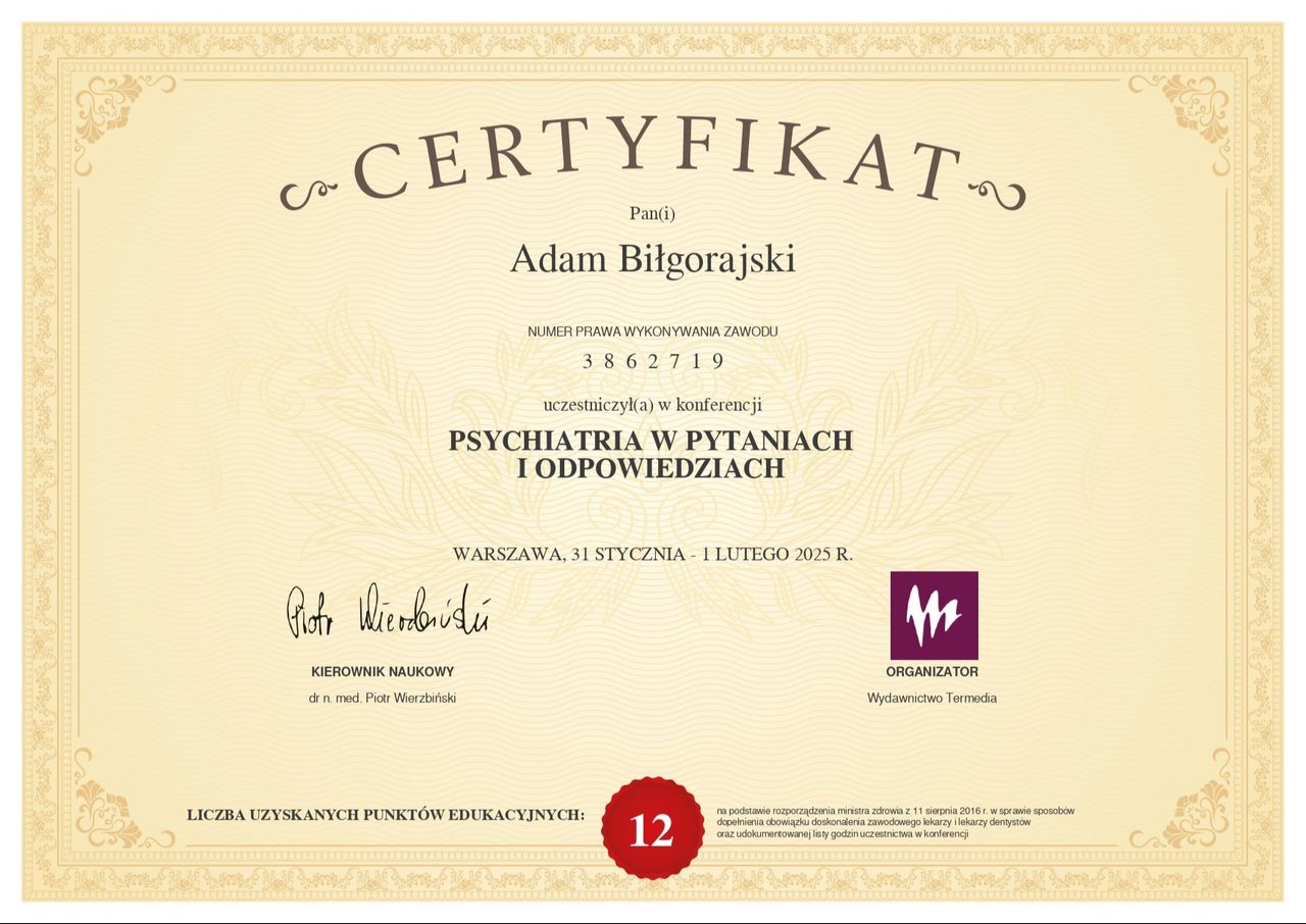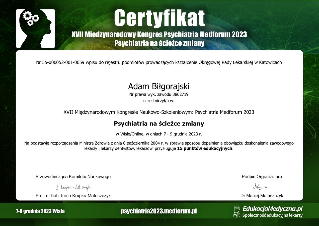 Jestem lekarzem w trakcie specjalizacji z psychiatrii dorosłych w Wojewódzkim Szpitalu dla Nerwowo i Psychicznie Chorych ,,Dziekanka” w Gnieźnie, wcześniej zdobywałem również doświadczenie w Centrum Medycznym HCP w Poznaniu. Ukończyłem w 2021 r. kierunek lekarski na Pomorskim Uniwersytecie Medycznym w Szczecinie.