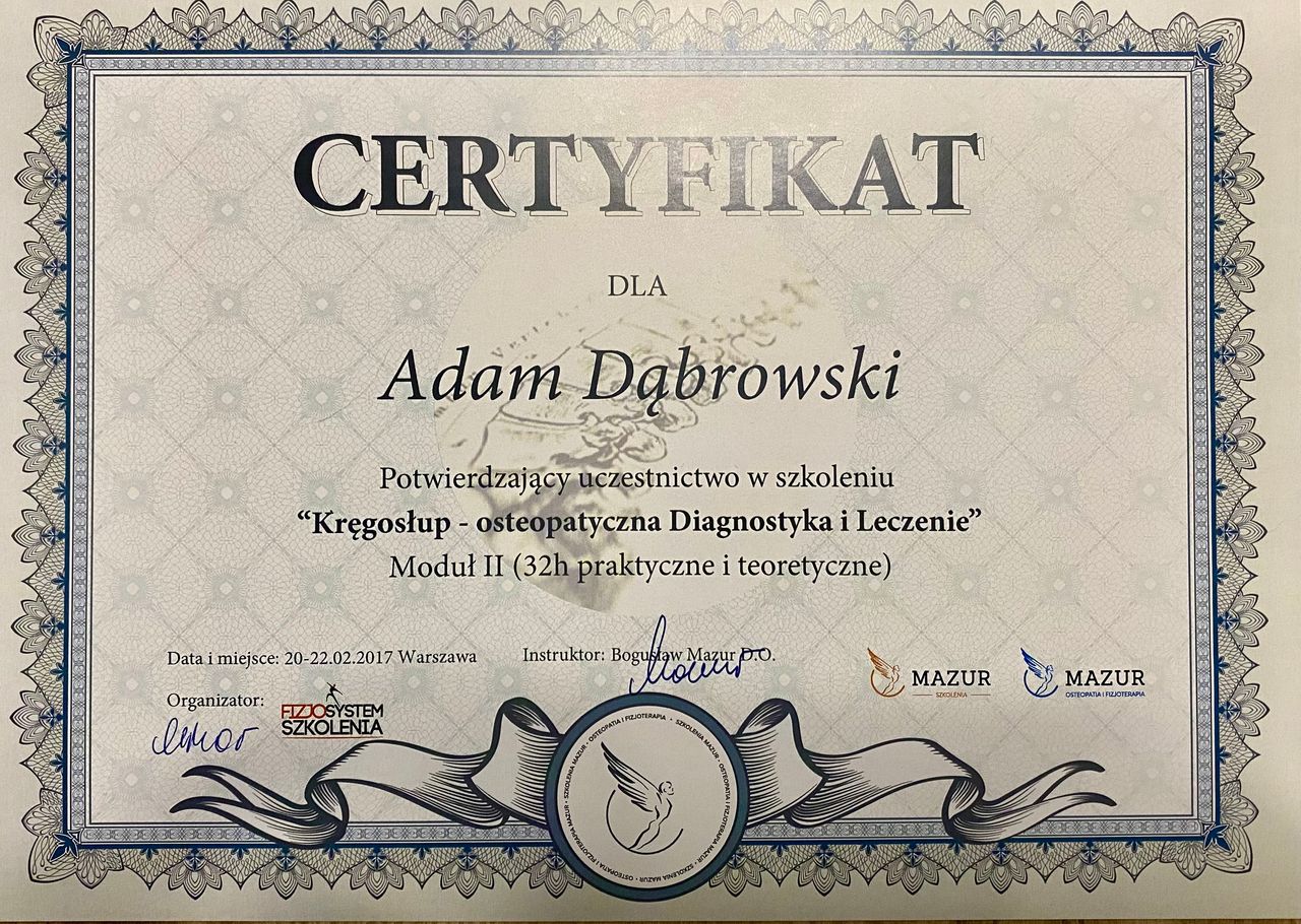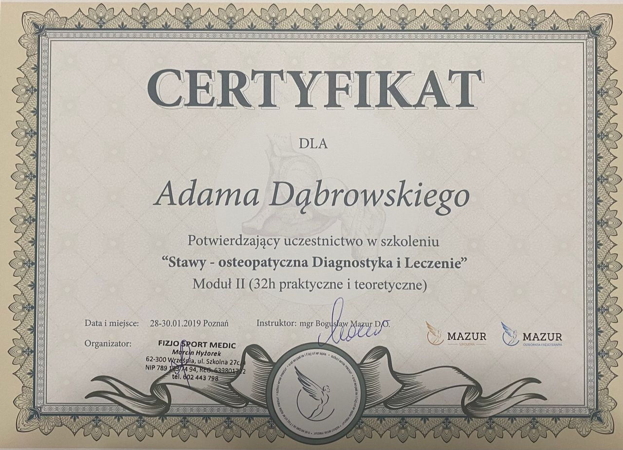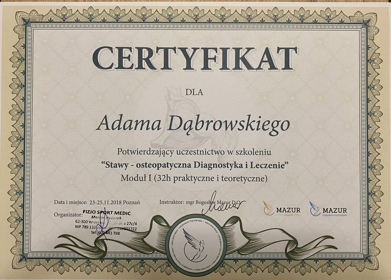 Jaki jest zakres porad oferowanych przez Adam Dąbrowski?Adam Dąbrowski to fizjoterapeuta, osteopata. Na podstawie swojego doświadczenia i wykształcenia Adam Dąbrowski oferuje usługi takie jak: fizjoterapia, osteopatia, Diagnostyka + Terapia Manualna, Terapia manualna z wykorzystaniem technik osteopatycznych, osteopatia pediatryczna (pierwsza wizyta), Fizjoterapia dyskopatii w ostrym stanie, Kolejna wizyta 60 min, Konsultacja fizjoterapeutyczna ( I wizyta, diagnoza + terapia ), Terapia czaszkowo-krzyżowa, terapia osteopatyczna.