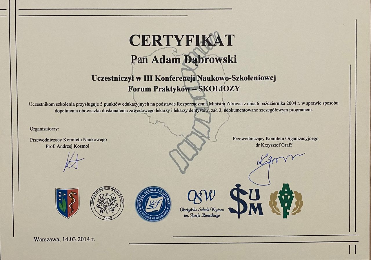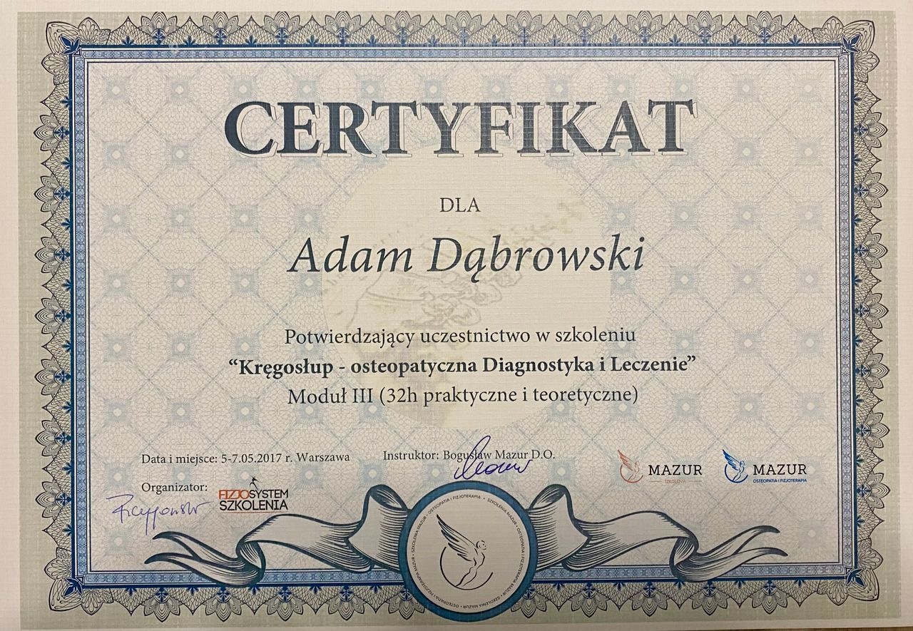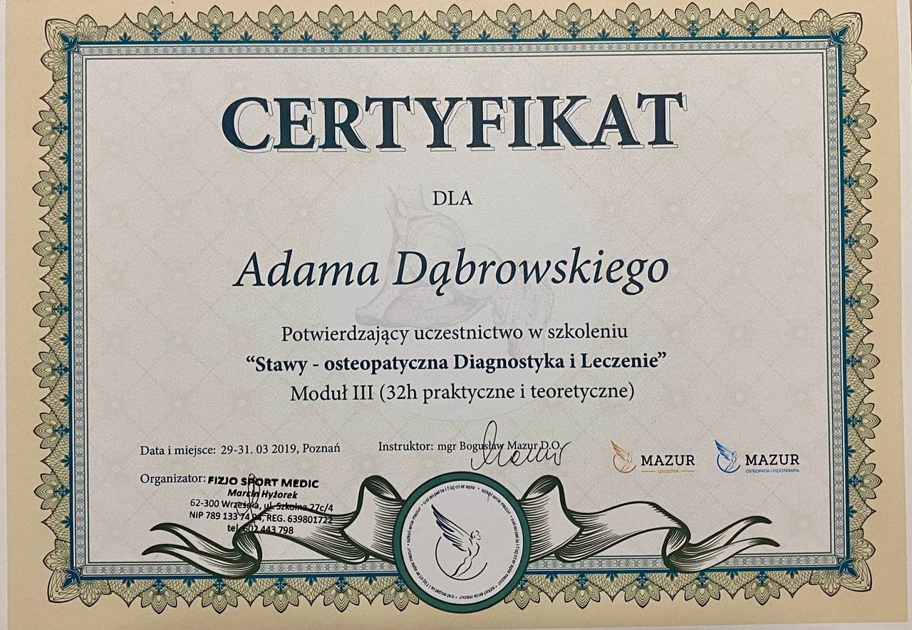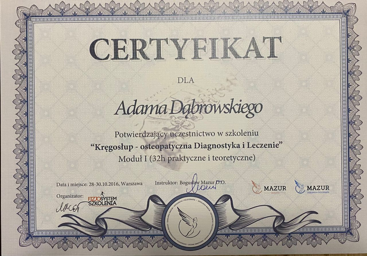Jaki jest zakres porad oferowanych przez Adam Dąbrowski?Adam Dąbrowski to fizjoterapeuta, osteopata. Na podstawie swojego doświadczenia i wykształcenia Adam Dąbrowski oferuje usługi takie jak: fizjoterapia, osteopatia, Diagnostyka + Terapia Manualna, Terapia manualna z wykorzystaniem technik osteopatycznych, osteopatia pediatryczna (pierwsza wizyta), Fizjoterapia dyskopatii w ostrym stanie, Kolejna wizyta 60 min, Konsultacja fizjoterapeutyczna ( I wizyta, diagnoza + terapia ), Terapia czaszkowo-krzyżowa, terapia osteopatyczna.