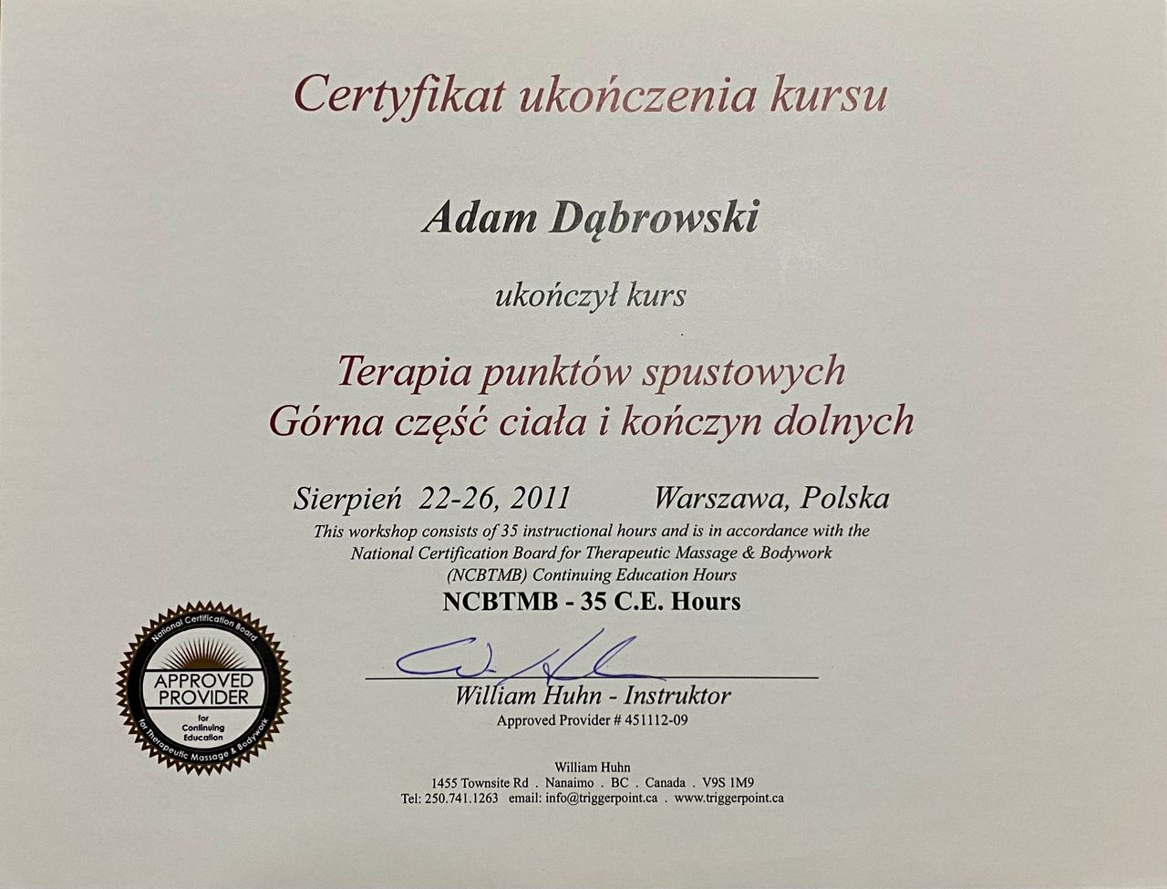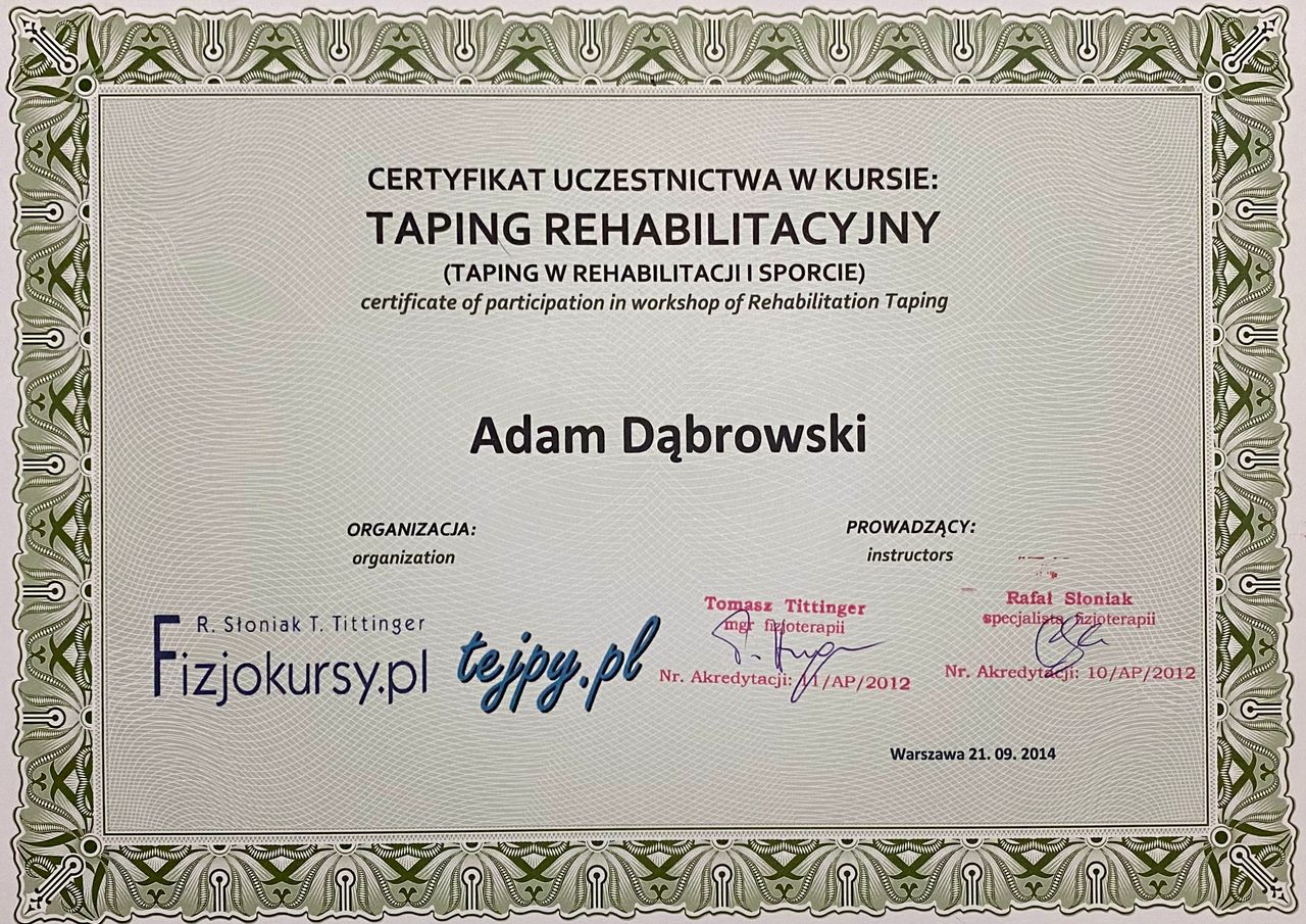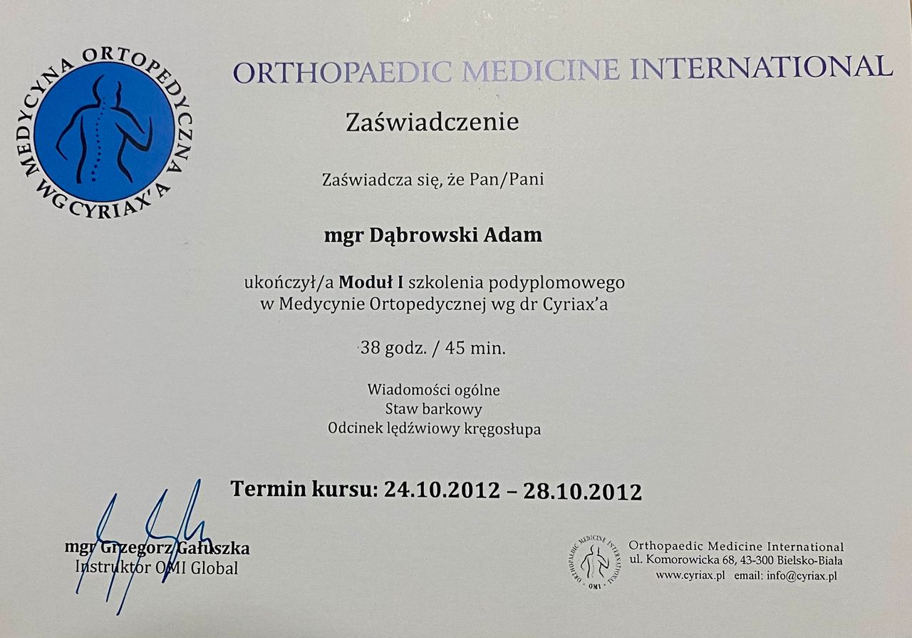 Z usług Pana Adama korzystam od lat, a mimo wszystko cały czas zaskakuje mnie jak prężnie i wielokierunkowo rozwija swoje umiejętność i wiedzę zawodową. Postawił mnie po wypadku samochodowym, jak również po każdej wizycie daje profesjonalne i trafne zalecenia. Jego metody pracy da bardzo skuteczne. Polecam !