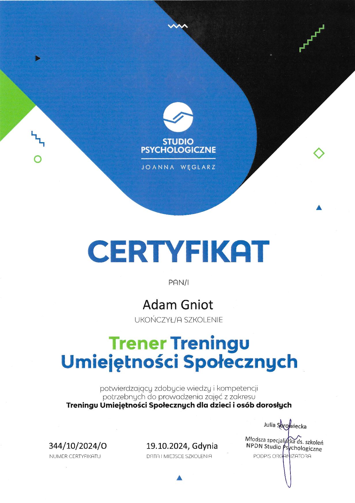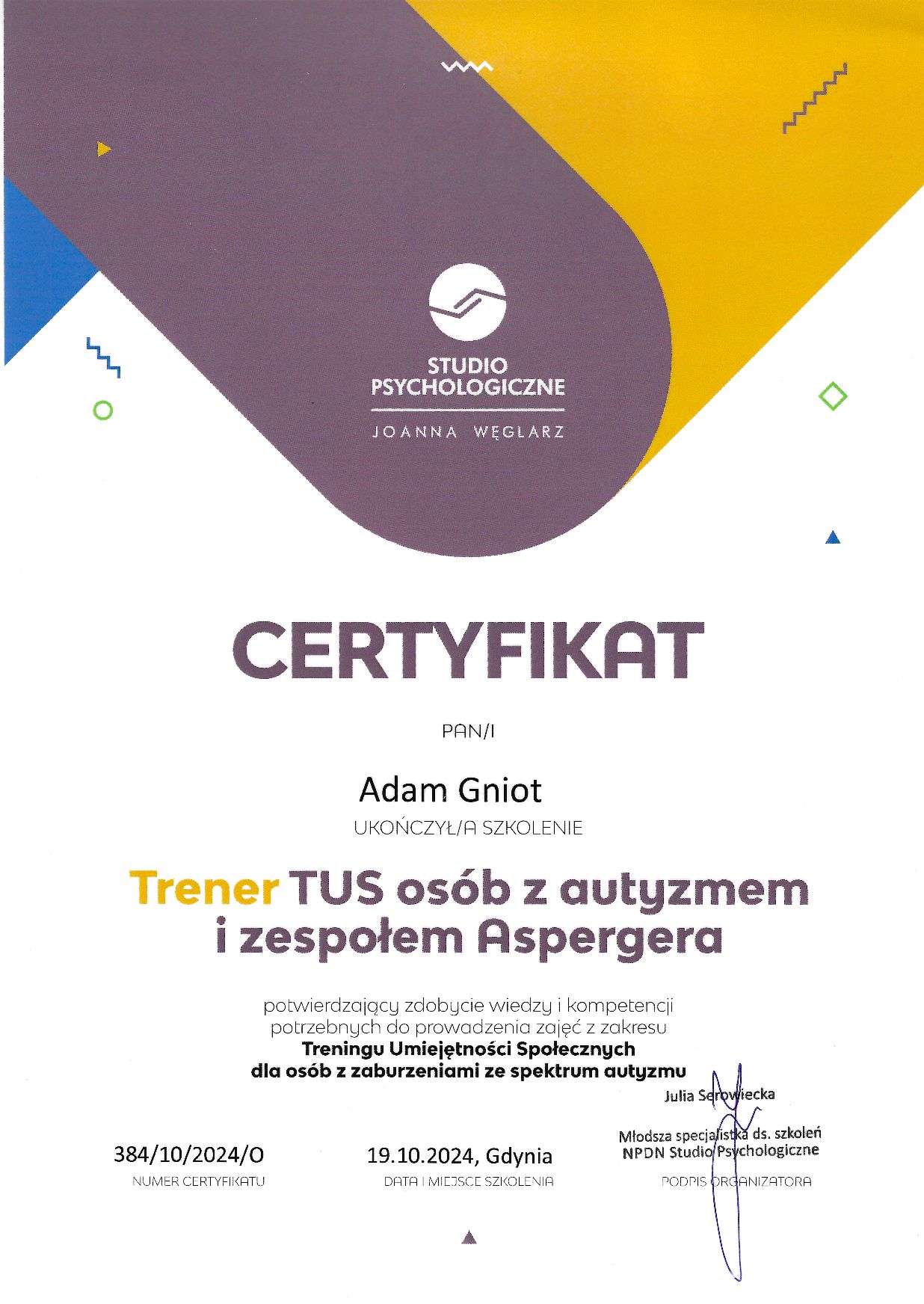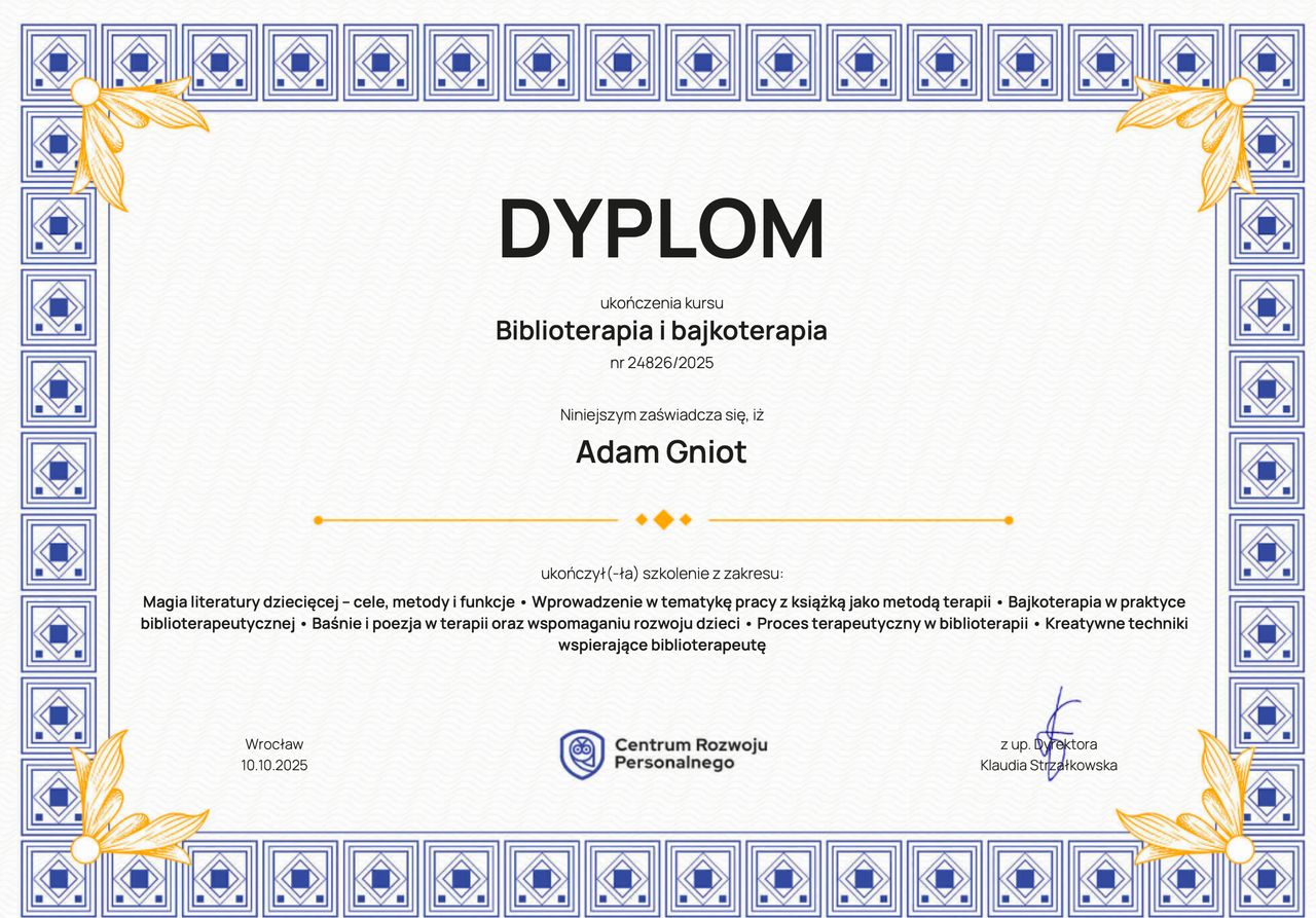 Tytuł magistra psychologii zdobyłem na Uniwersytecie Opolskim. Szkoliłem się w obszarze treningu umiejętności społecznych (TUS), spektrum autyzmu i ADHD. Szczególnie bliska jest mi neuropsychologia i neuroróżnorodność. W pracy zależy mi na tworzeniu przestrzeni, w której możesz spokojnie odkrywać swoją własną opowieść - to, co jest dla Ciebie najważniejsze.