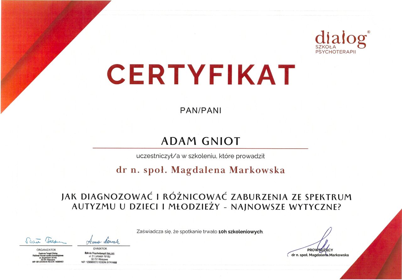 Jaki jest zakres porad oferowanych przez Adam Gniot?Adam Gniot to psycholog. Na podstawie swojego doświadczenia i wykształcenia Adam Gniot oferuje usługi takie jak: Konsultacja psychologiczna, testy psychologiczne, psychological consultation in English, konsultacja psychologiczna dzieci, konsultacja psychologiczna młodzieży, Diagnoza ADHD dzieci i młodzieży, Diagnoza ADHD test diva 5.0, Test AQ, Konsultacja psychologiczna online, Konsultacja psychologiczna dla rodziców online.