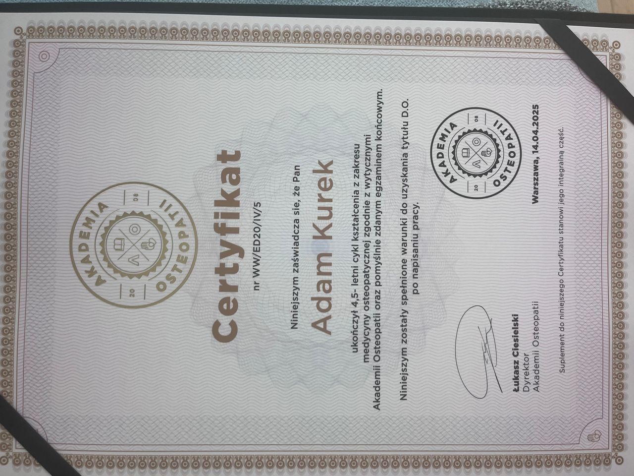 Adam Kurek jest bardzo utalentowanym specjalistą. Mówię to z płaszczyzny Pacjentki, która odbyła 4 wizyty, jako Rehabilitantka, która widziała, jak rzetelnie i wielowymiarowo pracuje, jako osoba borykająca się z dysfunkcjami (zaniki mięśni, entezy, obrzęki, dyskopatia, zrosty). Pan Adam rzetelnie wyjaśniał jak dysfunkcja trzewna (np zrost) wpływa na dysfunkcję mięśnia(np.biodrowo-lędźw.) a ten na asymetrię kości krzyżowej, i tu na dysfunkcję w biodrze - np. uszkadzanie obrąbka. Wiedząc liczne rzeczy jako jedyny umiał rozluźnić Mi napiętą żyłę biodrową wspólną, jako 1ny pracował w otworze zasłonowym, pomógł mi max, przy zrostach w trzewiach. Dzięki Niemu mój stan polepszył się o +80% ( innych to jakieś +25-30%). Jako jedyny polecił rzetelną specjalistkę Trenerkę Personalną i łączył również leczenie o dodatkowy pomocny przy regeneracji suplement. Myślał. Dociekał. Badał. Łączył fakty, opowiadał, pomagał. Chętny nauki i pokory. Słowem - nie mogłam lepiej trafić. Polecam Serdecznie!