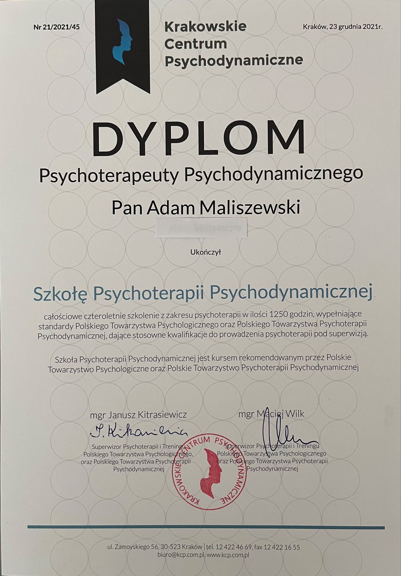 Jestem absolwentem psychologii Uniwersytetu SWPS. Ponadto ukończyłem czteroletnie szkolenie z zakresu psychoterapii psychodynamicznej organizowane przez Krakowskie Centrum Psychodynamiczne.