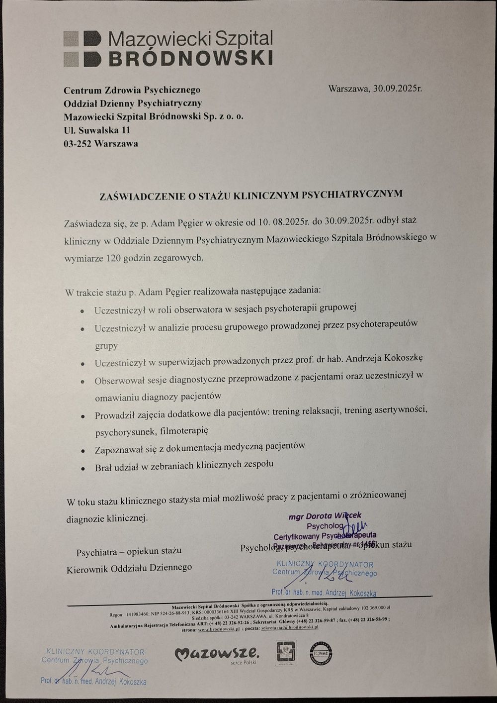 Pan Adam to specjalista, który naprawdę potrafi słuchać. Już od pierwszego spotkania czułam się swobodnie i bez oceniania. Dzięki terapii zrobiłam ogromny krok w stronę lepszego samopoczucia. Bardzo dziękuję i serdecznie polecam każdemu, kto szuka profesjonalnej i empatycznej pomocy.
