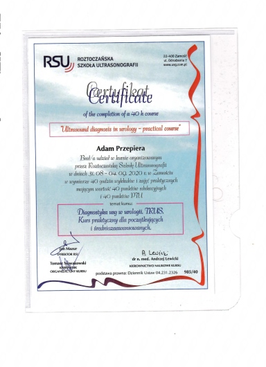 W 2020 roku uzyskał certyfikat ukończenia kursu ultrasonografii w Urologii.