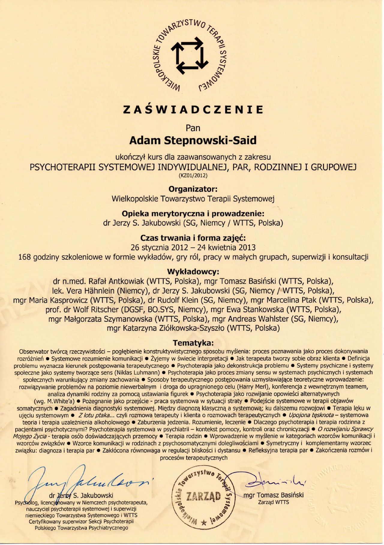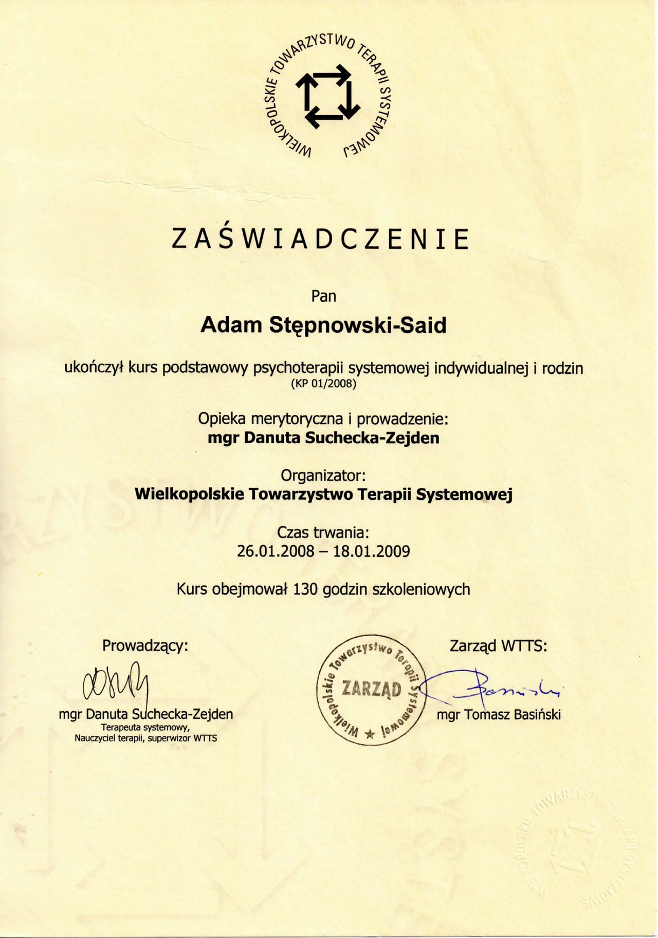 – Psychoterapii Systemowej (Kurs Podstawowy oraz Kurs Zaawansowany - WTTS)