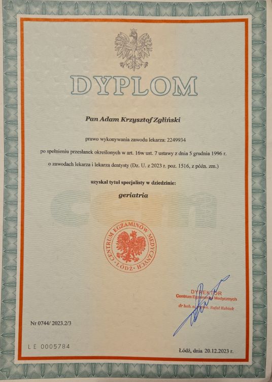 Nazywam się Adam Zgliński i jestem Geriatrą i Specjalistą Chorób Wewnętrznych. Moja pasja do opieki nad osobami starszymi rozwijała się przez lata pracy w różnych placówkach medycznych. Pracowałem w największych Szpitalach w Bydgoszczy i Toruniu. Swoje doświadczenie zdobywałem zarówno w Klinice Geriatrii, jak i na Szpitalnym Oddziale Ratunkowym, gdzie nauczyłem się szybkiego podejmowania właściwych decyzji. Obecnie pełnię funkcję Dyrektora ds. Medycznych w Szpitalu w Golubiu-Dobrzyniu, gdzie pracuję na Oddziale Chorób Wewnętrznych.