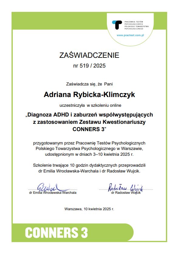 Czy Adriana Rybicka Klimczyk przyjmuje online, bez konieczności pojawiania się w placówce?Tak, Adriana Rybicka Klimczyk oferuje konsultacje online. Wybierz opcję „konsultacja online” przy umawianiu wizyty, a zobaczysz dostępne terminy.