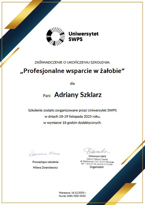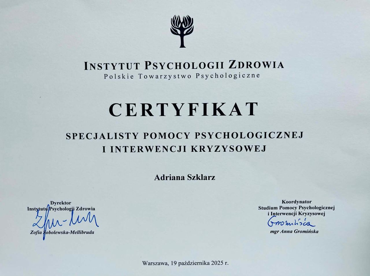 Jestem psychologiem oraz certyfikowanym interwentem kryzysowym IPZ przy Polskim Towarzystwie Psychologicznym.