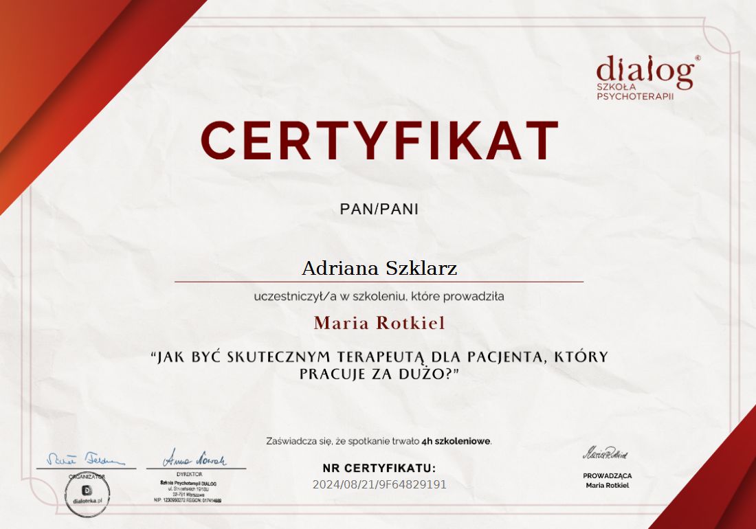 Czy Adriana Szklarz przyjmuje online, bez konieczności pojawiania się w placówce?Tak, Adriana Szklarz oferuje konsultacje online. Wybierz opcję „konsultacja online” przy umawianiu wizyty, a zobaczysz dostępne terminy.