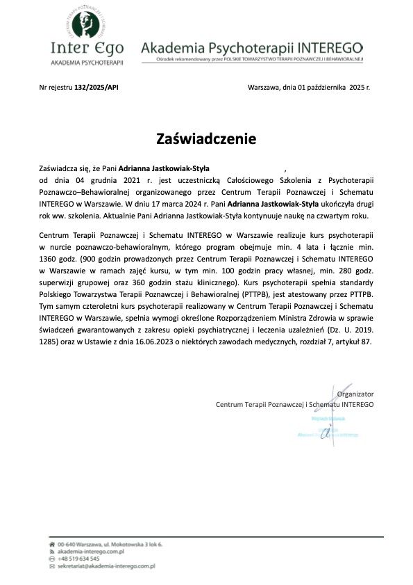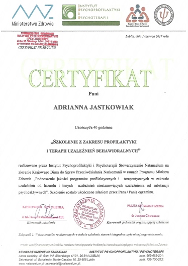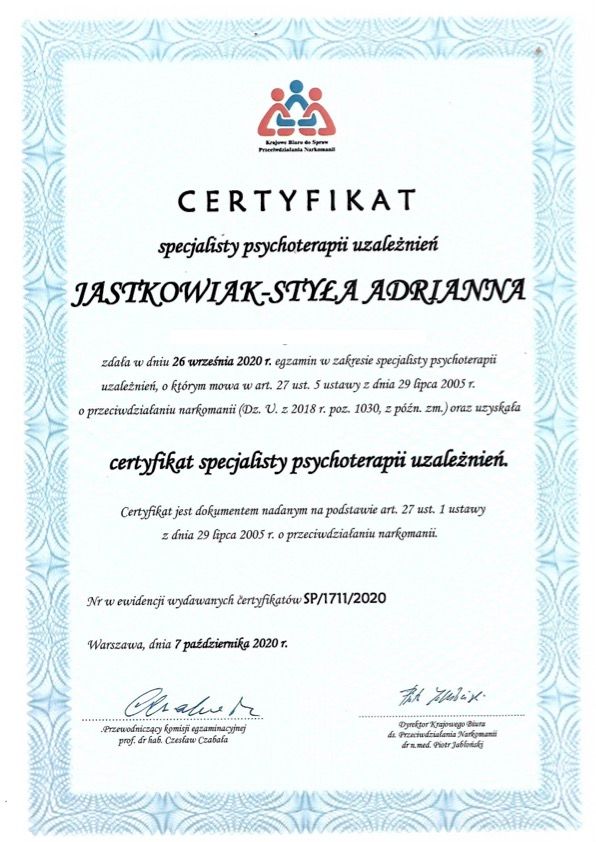 Jestem psychologiem, spec. psychoterapii uzależnień oraz psychoterapeutą poznawczo-behawioralnym w trakcie certyfikacji. Przyjmuję pacjentów w gabinecie przy ul. Sowińskiego 4/17 w Lublinie oraz online.