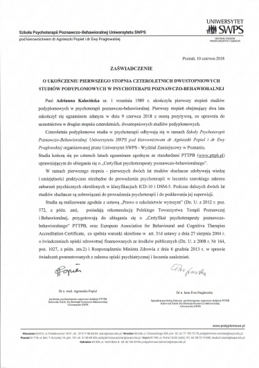 Jestem absolwentką Wydziału Psychologii Uniwersytetu Warszawskiego. Jestem również absolwentką 4-letniej Szkoły Psychoterapii Poznawczo-Behawioralnej Uniwersytetu SWPS, studiów rekomendowanych przez Polskie Towarzystwo Terapii Poznawczo-Behawioralnej. Ukończyłam studia podyplomowe na kierunku Psychoonkologia, będącym pod patronatem Polskiego Towarzystwa Psychoonkologicznego oraz Krajowej Szkoły Psychoonkologii. Ukończyłam całościowy kurs Terapii Schematu, przygotowującym do uzyskania oficjalnego certyfikatu terapeuty schematu (Standard Level Schema Therapy) w Centrum CBT w Warszawie. Aktualnie szkolę się w 2-letnim kursie dokszałcającym w Seksuologii Klinicznej na Uniwersytecie Adama Mickiewicza w Poznaniu, a takż w Studium Pomocy Psychologicznej dla Par w Instytucie Psychologii Zdrowia w Warszawie. Nieustannie podnoszę swoje kompetencje, aby móc zapewnić jak najlepszą i skuteczną pomoc.