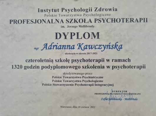 Współpracuję z Panią Adrianną ponad rok i mogę śmiało powiedzieć, że zmienia ona moje życie na lepsze. Pani Adrianna charakteryzuje się niesamowitą empatią oraz zrozumieniem. Zwraca uwagę na każdy szczegół, o którym ja sam potrafię zapomnieć, a wspominałem o nim kilka wizyt wcześniej. Rozmowa z Panią Adrianną pozwala mi nazywać, nienazywane wcześniej emocje oraz przede wszystkim radzić sobie z nimi. Czuję, że nie ma problemu, o którym nie mógłbym porozmawiać z Panią Adrianną. Zdecydowanie polecam!