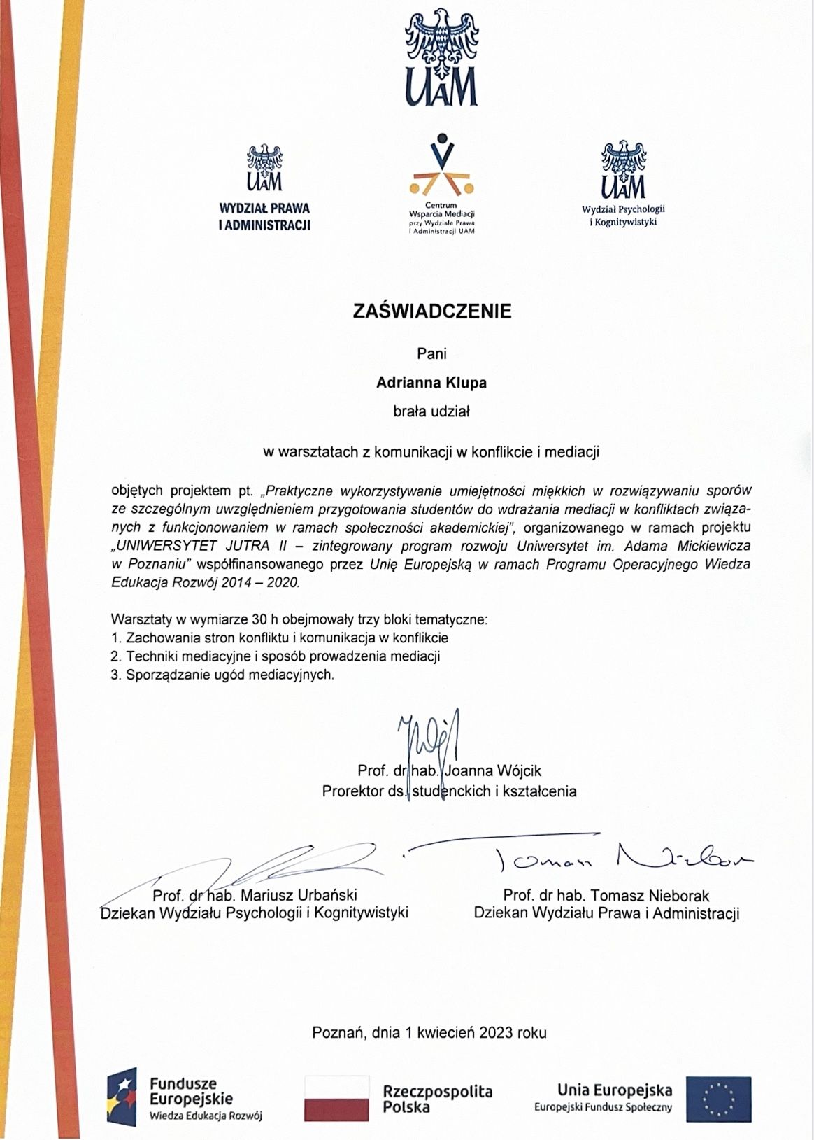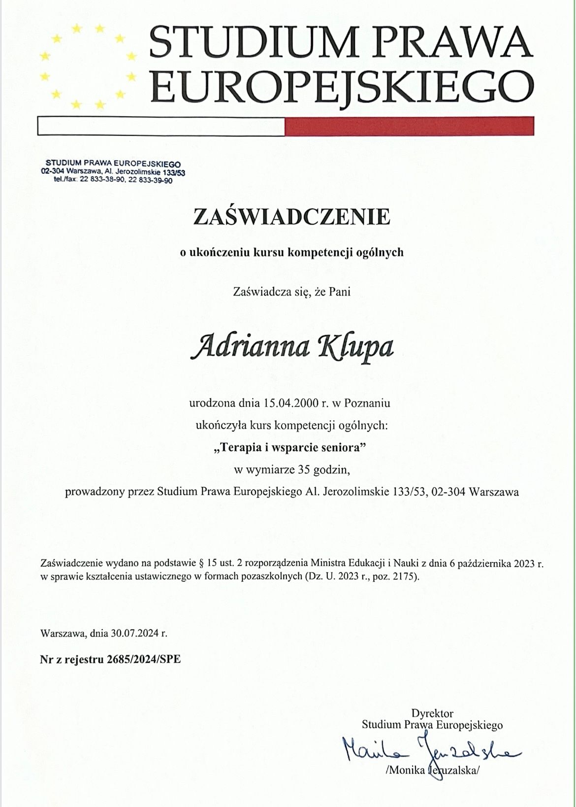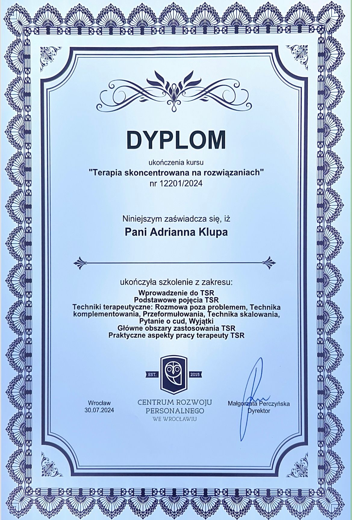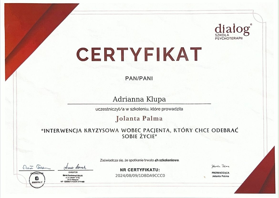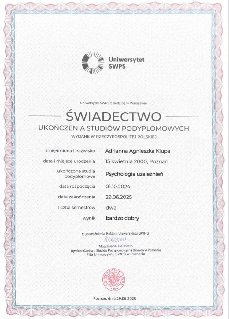 Nieustannie dbam o rozwój zawodowy, regularnie biorąc udział w specjalistycznych szkoleniach i warsztatach. Posiadam certyfikaty poświadczające odbycie następujących kursów: "Komunikacja w konflikcie i mediacji", "Spektrum autyzmu w perspektywie neuroróżnorodności", "Terapia skoncentrowana na rozwiązaniach (TSR)", "Terapia i wsparcia seniora".