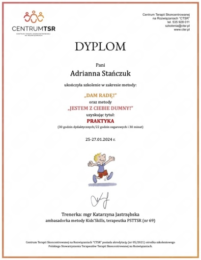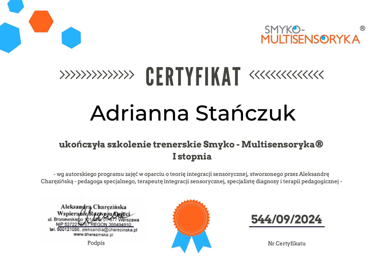 Nazywam się Adrianna Stańczuk i jestem psychologiem oraz uczestniczką 4-letniego szkolenia w nurcie integracyjno-systemowym. Wykształcenie psychologiczne uzyskałam na Uniwersytecie Warszawskim. Na psychoterapeutę szkolę się w Szkole Psychoterapii Dialog w Warszawie. Ukończyłam kurs I stopnia Terapii Skoncentrowanej na Rozwiązaniach, kurs Kids’ Skill oraz szkolenia z arteterapii oraz Smykomultisensoryki. Posiadam przygotowanie pedagogiczne.