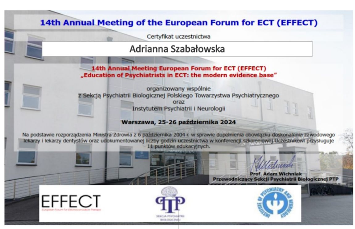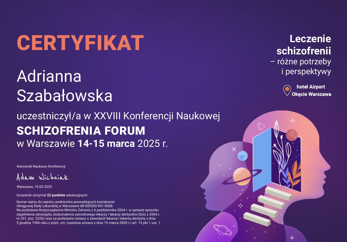Jestem lekarzem w trakcie szkolenia specjalizacyjnego w Klinice Psychiatrii Dorosłych Uniwersyteckiego Centrum Klinicznego w Gdańsku. Zajmuję się diagnostyką oraz leczeniem zaburzeń psychicznych u osób dorosłych. W 2022r. kończyłam studia na kierunku lekarskim na Gdańskim Uniwersytecie Medycznym. Od 2024r jestem uczestnikiem studiów podyplomowych w Szkole Psychoterapii Poznawczo-Behawioralnej Uniwersytetu SWPS. Psychiatria jest moją pasją od początku studiów – od tego czasu stale poszerzam swoją wiedzę śledząc najnowsze doniesienia naukowe oraz uczestnicząc w konferencjach. Istotne jest dla mnie całościowe podejście do pacjenta celem dopasowania leczenia do jego potrzeb indywidualnych oraz utworzenie wraz z nim optymalnego planu leczenia.