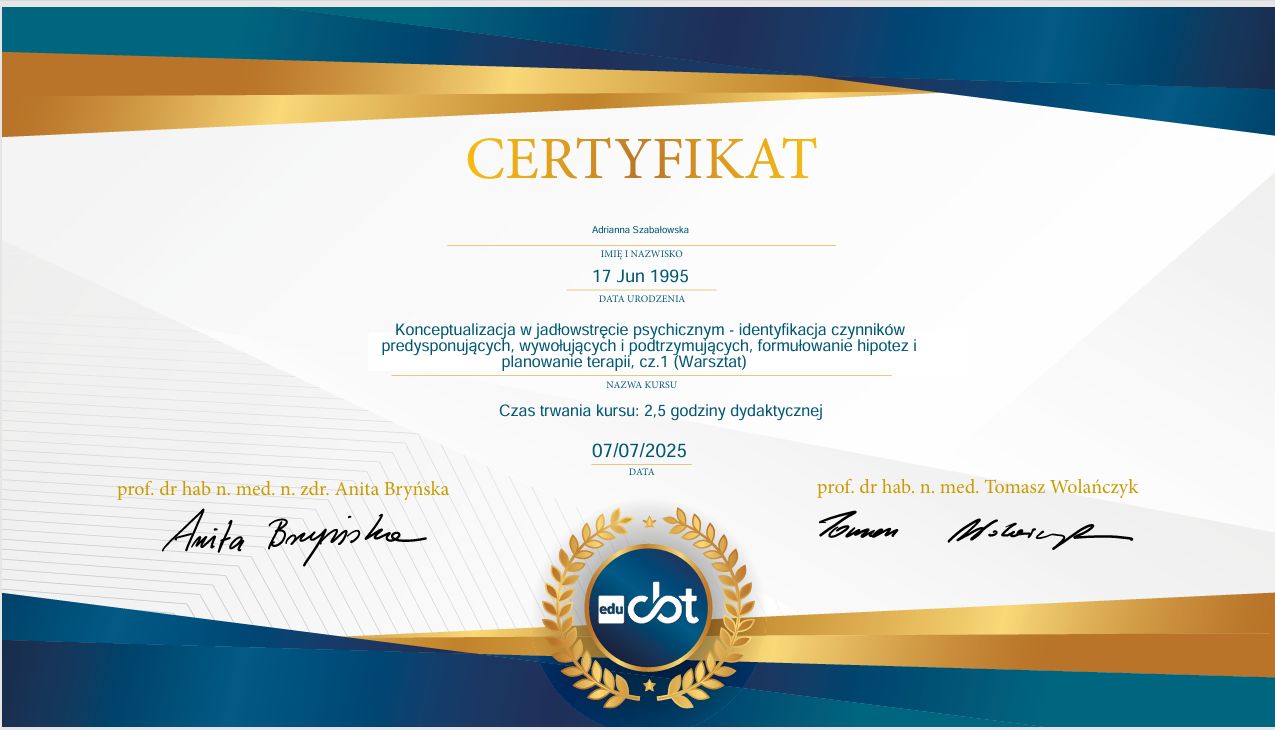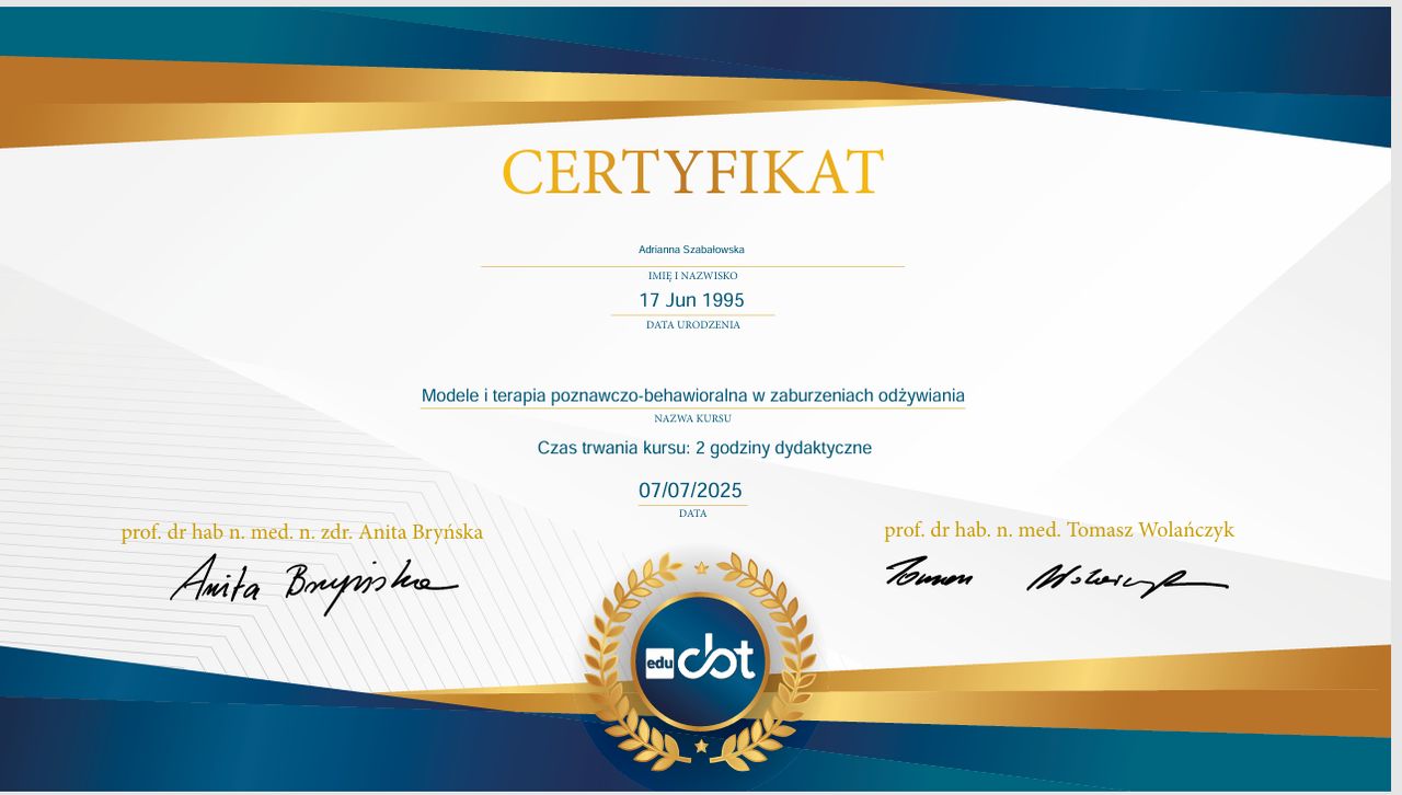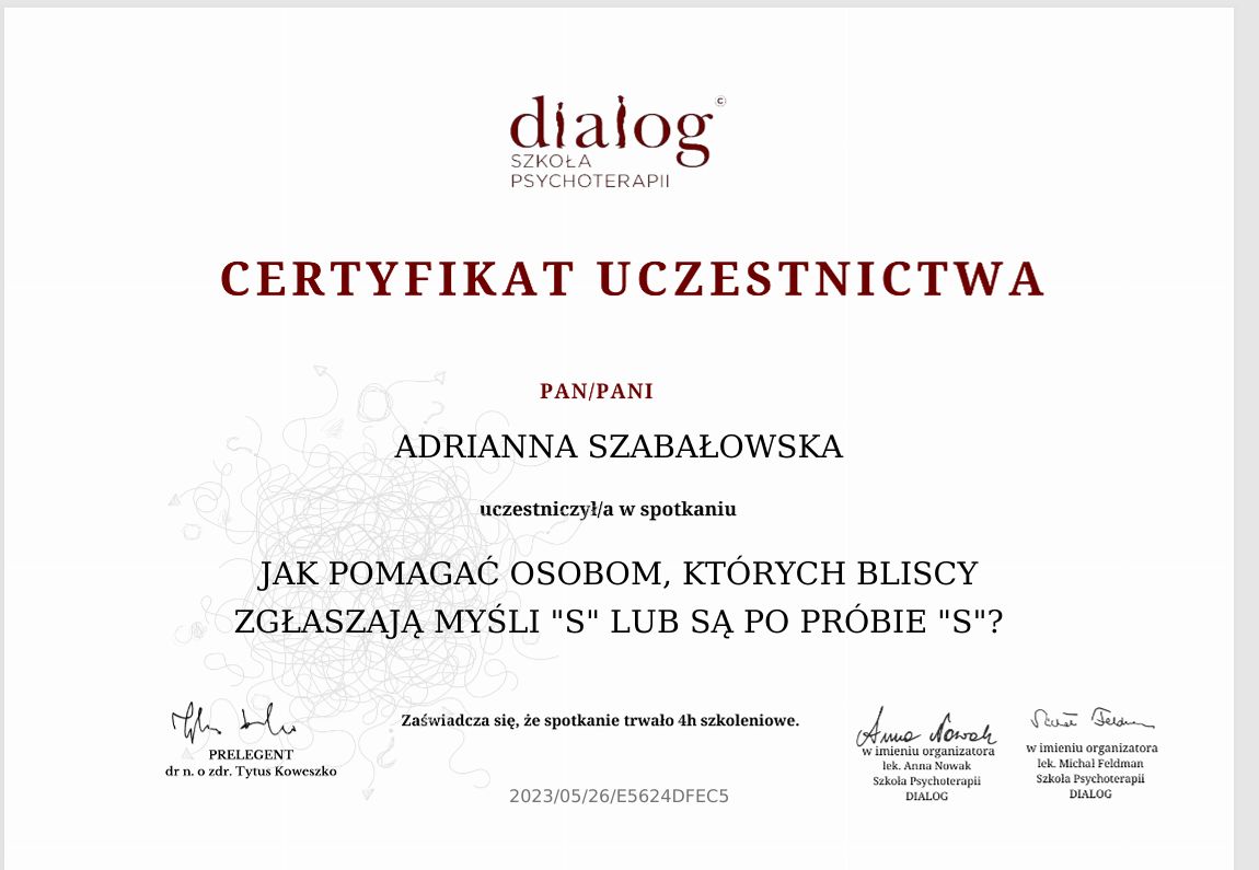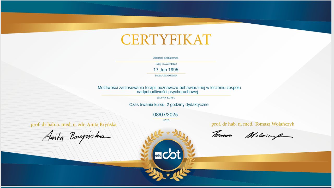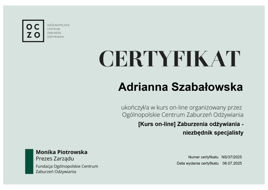 Czy Adrianna Szabałowska przyjmuje online, bez konieczności pojawiania się w placówce?Nie, w tym momencie Adrianna Szabałowska nie oferuje konsultacji online.