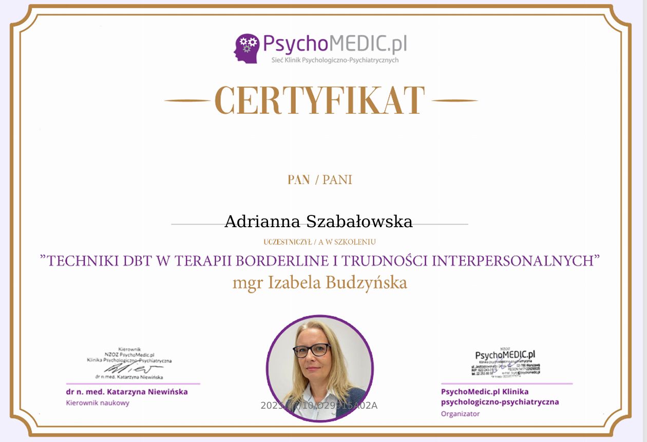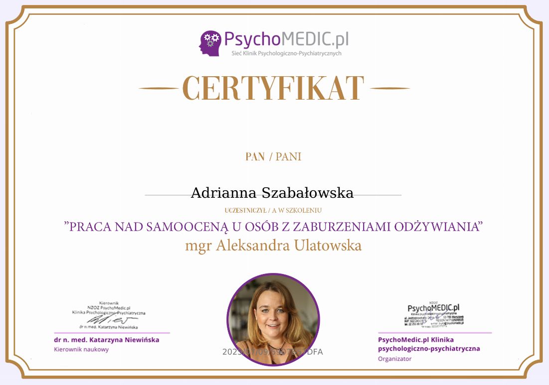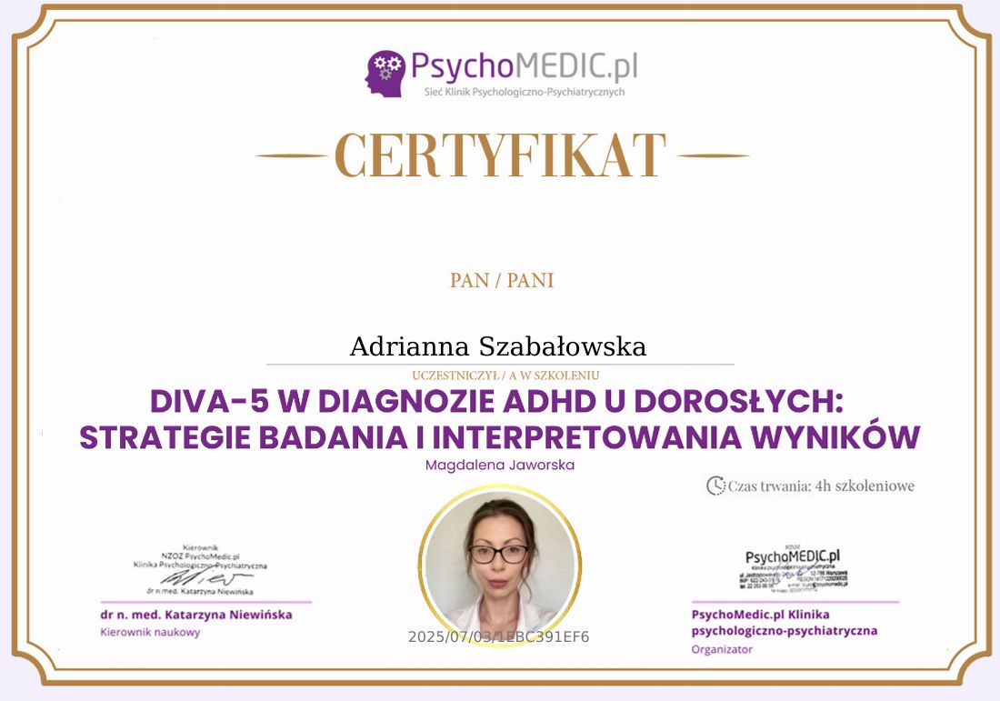 Jaki jest zakres porad oferowanych przez Adrianna Szabałowska?Adrianna Szabałowska to w trakcie specjalizacji (psychiatra). Na podstawie swojego doświadczenia i wykształcenia Adrianna Szabałowska oferuje usługi takie jak: konsultacja psychiatryczna, konsultacja psychiatryczna (kolejna wizyta), Konsultacja psychiatryczna online (kolejna wizyta), konsultacja psychiatryczna (pierwsza wizyta).