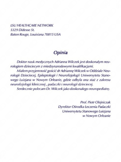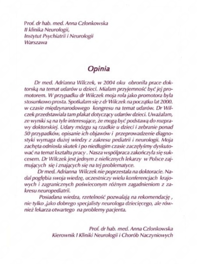 Wyrazem mojej pasji, którą stanowi neurologia dziecięca, było i jest uczestnictwo w licznych światowych i europejskich kongresach neurologicznych w dziedzinie neurologii, padaczki, stwardnienia rozsianego, chorób naczyniowych mózgu, w tym w najbardziej prestiżowym kongresie na świecie, jakim jest Amerykańska Akademia Neurologii (15-krotny udział). Wykaz certyfikatów znajduje się w załączeniu. Odbyłam również staż zagraniczny z zakresu neurologii dziecięcej i elektrofizjologii na Klinicznym Uniwersytecie Neurologii Dziecięcej w Luizjanie. Od 1998 roku oferuję porady specjalistyczne z zakresu neurologii dziecięcej w moim gabinecie we Wrocławiu.