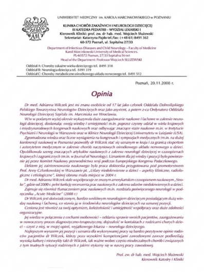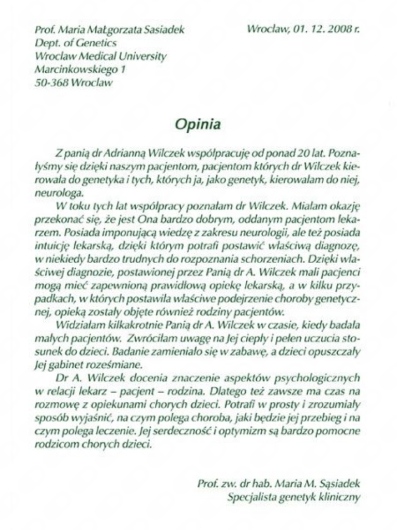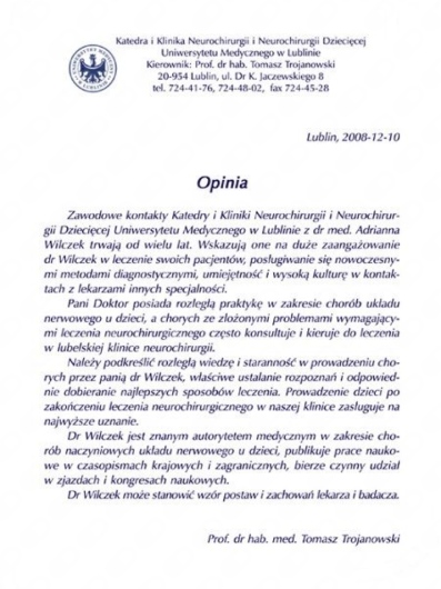 Opinia ta zawiera nieprawdziwe i niepełne informacje. Do badania nie doszło z powodów niezależnych ode mnie. Matka odmówiła rozebrania dziecka i wejścia do głównego pomieszczenia w ktorym przerowadzałam z ojcem wywiad , tłumacząc to jego niechęcią, mimo że jest to warunek konieczny do przeprowadzenia pełnego badania neurologicznego.Pozostawala w pokoju przygotowawczym dla dzieci.