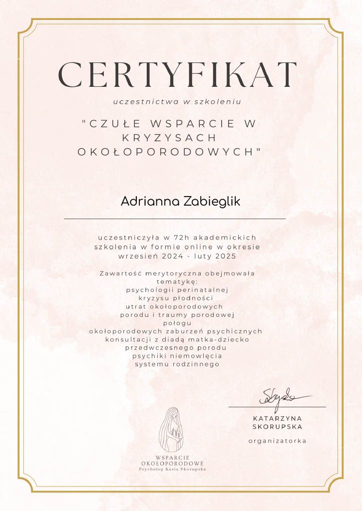 Jaki jest zakres porad oferowanych przez Adrianna Zabieglik?Adrianna Zabieglik to psycholog, psychoterapeuta. Na podstawie swojego doświadczenia i wykształcenia Adrianna Zabieglik oferuje usługi takie jak: psychoterapia indywidualna, Konsultacja psychologiczna, konsultacja dla kobiet w ciąży i po porodzie, psychoterapia młodzieży.