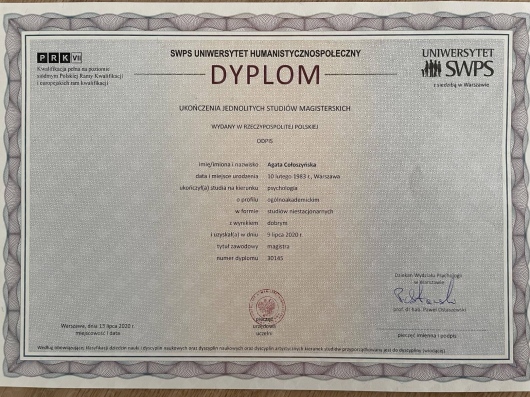 Doświadczasz trudności zawodowych lub prywatnych? Zmagasz się z kryzysem, stresem lub trudnymi emocjami? Zapraszam na konsultację, która pomoże Ci określić drogę do rozwiązania problemów. Jaka psycholog i psychoterapeutka pracuję w Centrum Terapii Dialog i prowadzę własną praktykę, w której kluczowe jest dla mnie indywidualne podejście do każdego pacjenta. Z wykształcenia jestem psycholożką i socjolożką, certyfikowaną coach i psychoterapeutką w trakcie szkolenia w szkole psychoterapii Gestalt w Warszawie. Pracuję stacjonarnie oraz on-line. Wspieram ludzi od 10 lat w indywidulanych obszarach rozwoju i pracy nad trudnościami. Ukończyłam liczne szkolenia i kursy na Uniwersytecie SWPS czy INTRA, pozwalające mi skutecznie pomagać. Kluczowe jest dla mnie zbudowanie bezpiecznej relacji opartej na wzajemnym zaufaniu, szczerości i otwartości.
