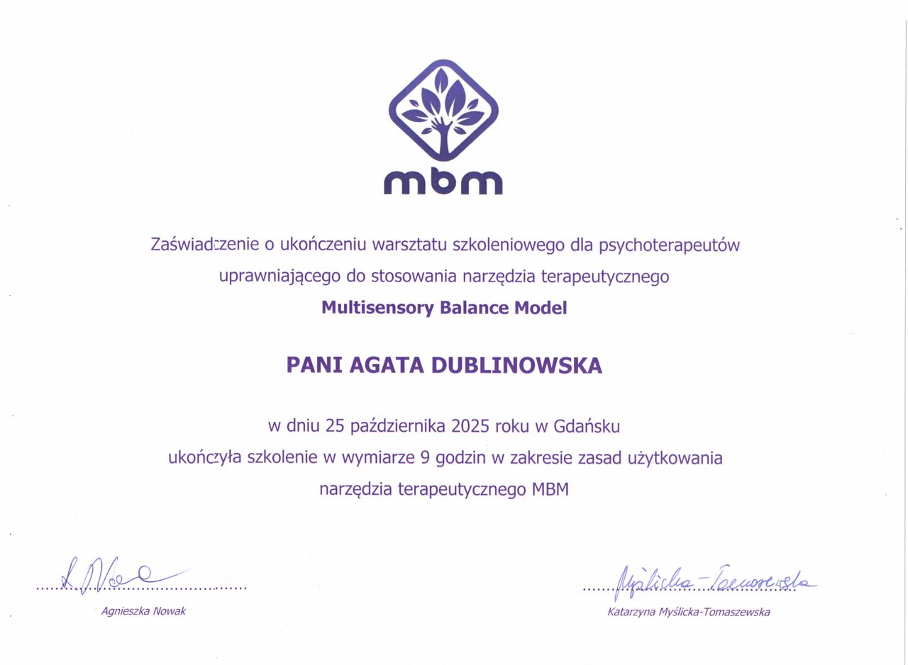 Miałam przyjemność uczestniczyć w terapii u Pani Agaty przez pół roku. Z pełnym przekonaniem mogę powiedzieć, że bardzo dużo wyciągnęłam z naszych spotkań — pomogły mi lepiej zrozumieć siebie i poradzić sobie w codziennych sytuacjach. Pani Agata jest uważna, empatyczna i profesjonalna. Z całego serca polecam współpracę z nią każdemu, kto szuka realnej zmiany i wsparcia.