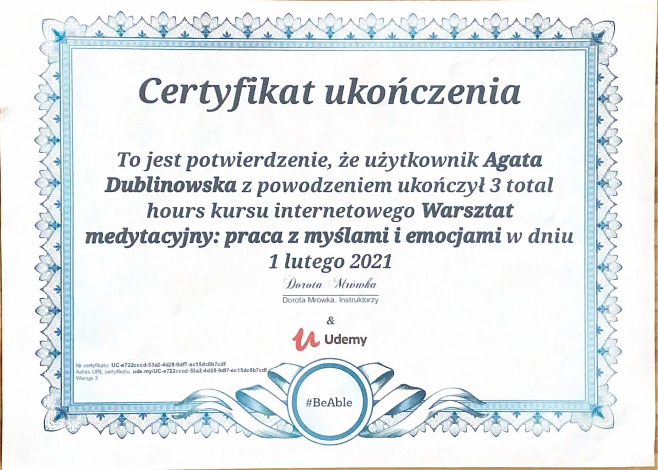 Byłam u pani Agaty na wizycie i mogę szczerze powiedzieć, że to bardzo ciepła i zaangażowana osoba. Potrafi słuchać, nie ocenia i daje poczucie bezpieczeństwa. Rozmowa przebiegła w spokojnej atmosferze, a jej wskazówki naprawdę dały mi do myślenia. Wyszłam z poczuciem ulgi i większej jasności w głowie. Zdecydowanie warto skorzystać z pomocy Pani Agaty!