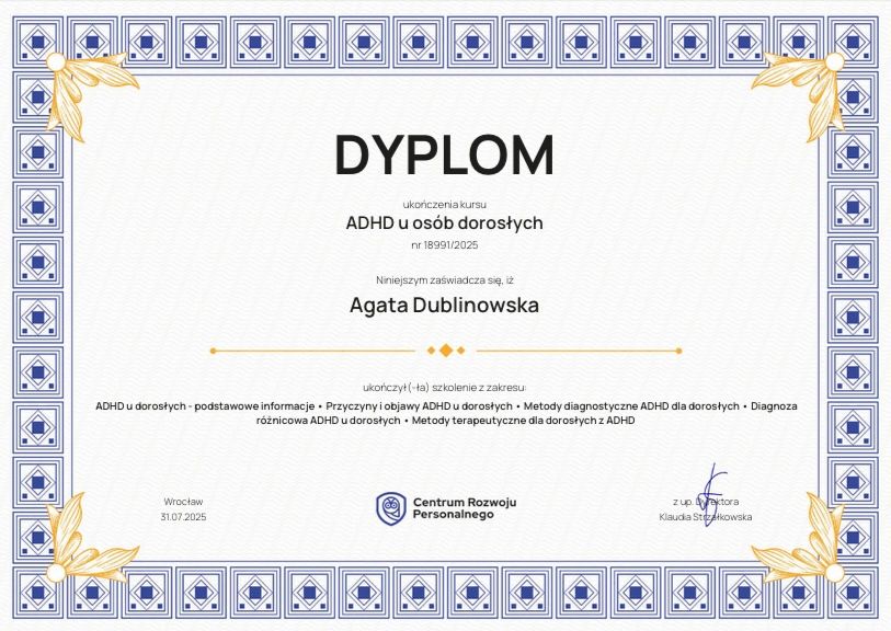 Czy Agata Dublinowska przyjmuje online, bez konieczności pojawiania się w placówce?Tak, Agata Dublinowska oferuje konsultacje online. Wybierz opcję „konsultacja online” przy umawianiu wizyty, a zobaczysz dostępne terminy.