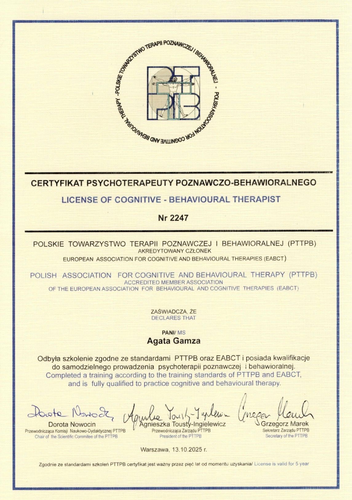 Psychologię ukończyłam na Uniwersytecie Opolskim. Następnie podjęłam studia podyplomowe z seksuologii klinicznej na Uniwersytecie SWPS w Katowicach. Jestem absolwentką pierwszego stopnia czteroletnich, dwustopniowych studiów podyplomowych w psychoterapii poznawczo-behawioralnej Szkoły Psychoterapii Poznawczo-Behawioralnej Uniwersytetu SWPS.