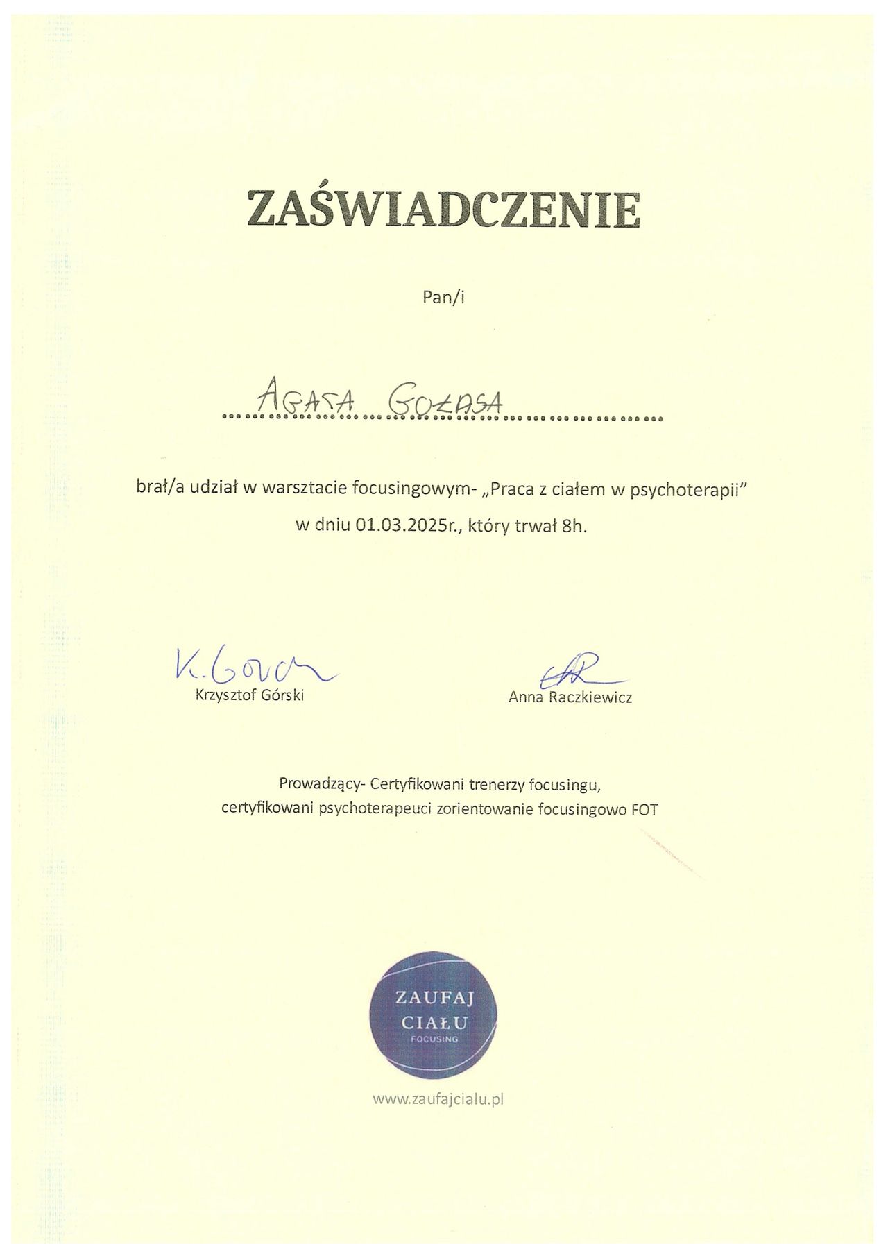 Należę do Polskiego Towarzystwa Humanistyczno-Doświadczeniowego.