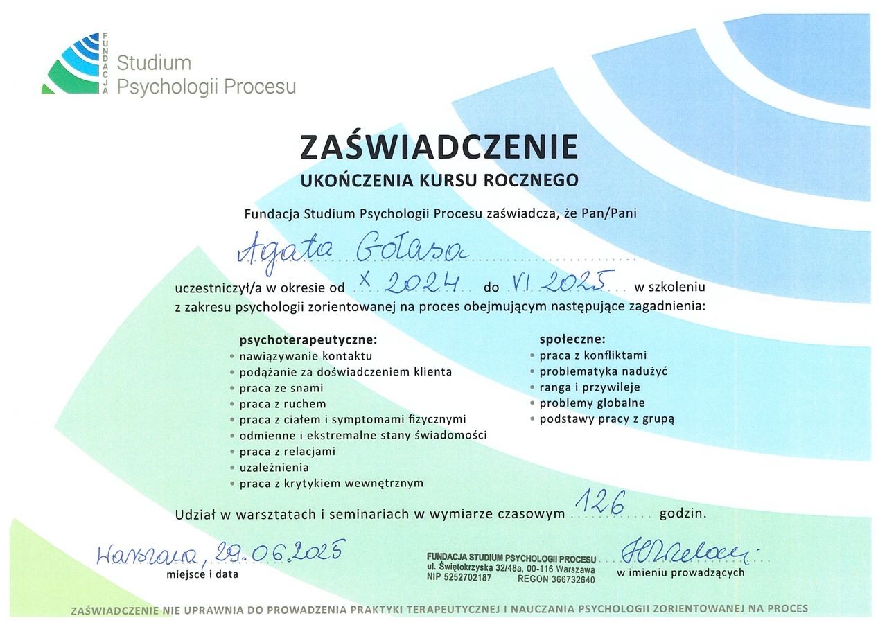 Agata jest niesamowicie obecnym i empatycznym terapeutą. Jej wsparcie i otwartość dodaje odwagi do pracy nad tymi rzeczami, z którymi bylo mi bardzo trudno. Jestem bardzo wdzięczna za jej prowadzenie i łączenie kropek, dzięki którym potrafię spojrzeć na wiele sytuacji z dystansu i innej perspektywy. W pracy z Nią czułam się zobaczona, wysłuchana i dobrych rękach. Dziękuję i bardzo polecam pracę z Agatą.