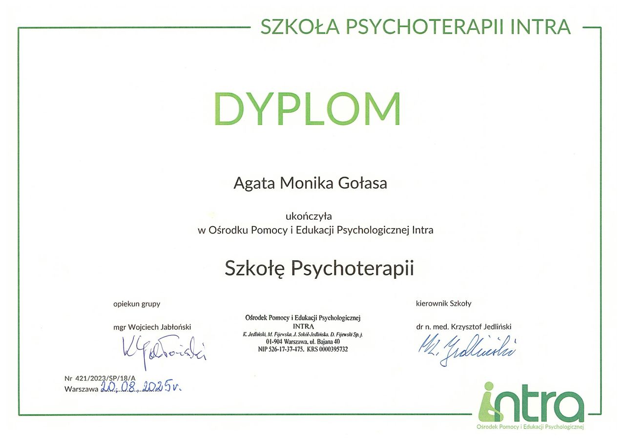 Mam za sobą już kilka spotkań i przyznam, że nie spodziewałam się, że przy pierwszym podejściu do psychoterapii trafię tak dobrze. Pani Agata jest ciepłą i empatyczną osobą. Już po pierwszych spotkaniach poczułam ulgę i nabrałam wiary że dalsza praca pomoże uporać mi się z moimi problemami.