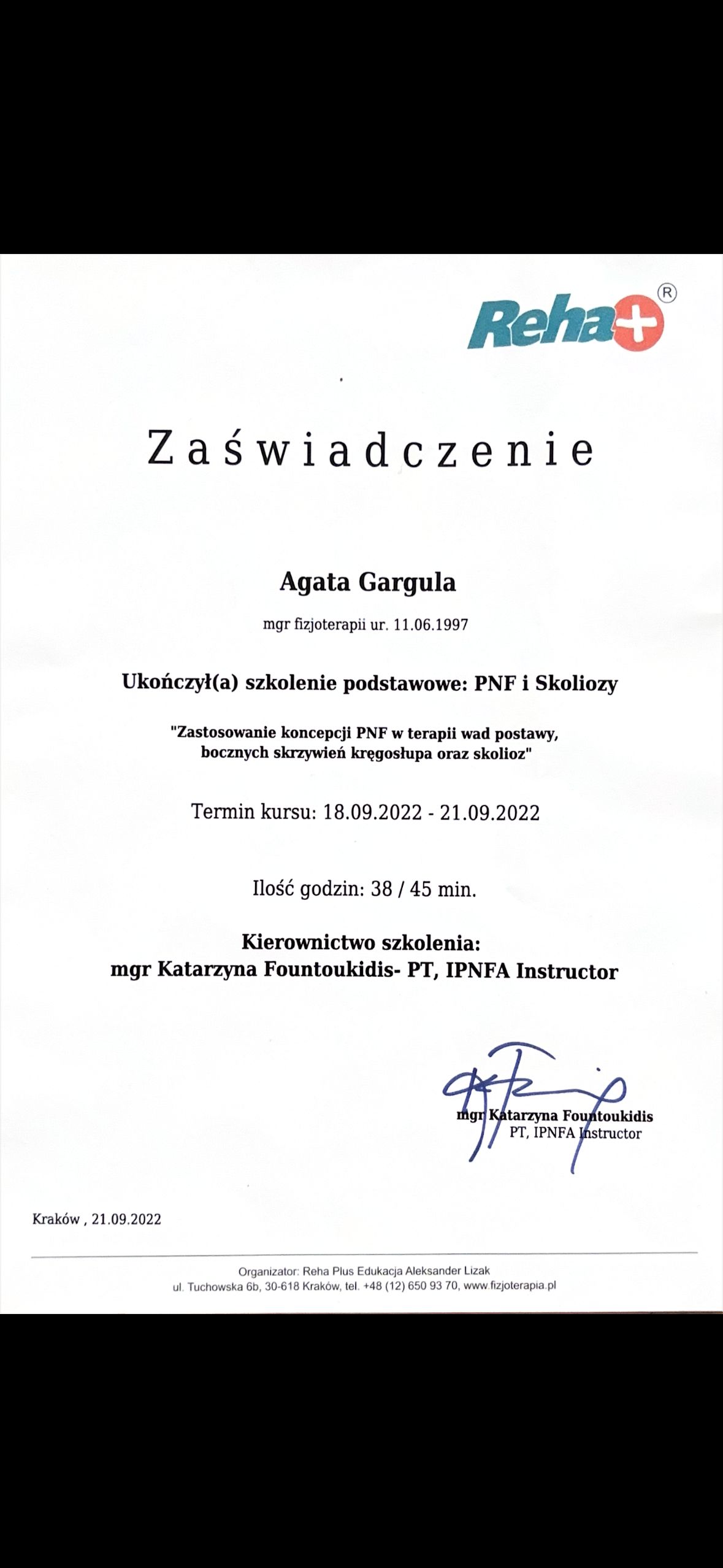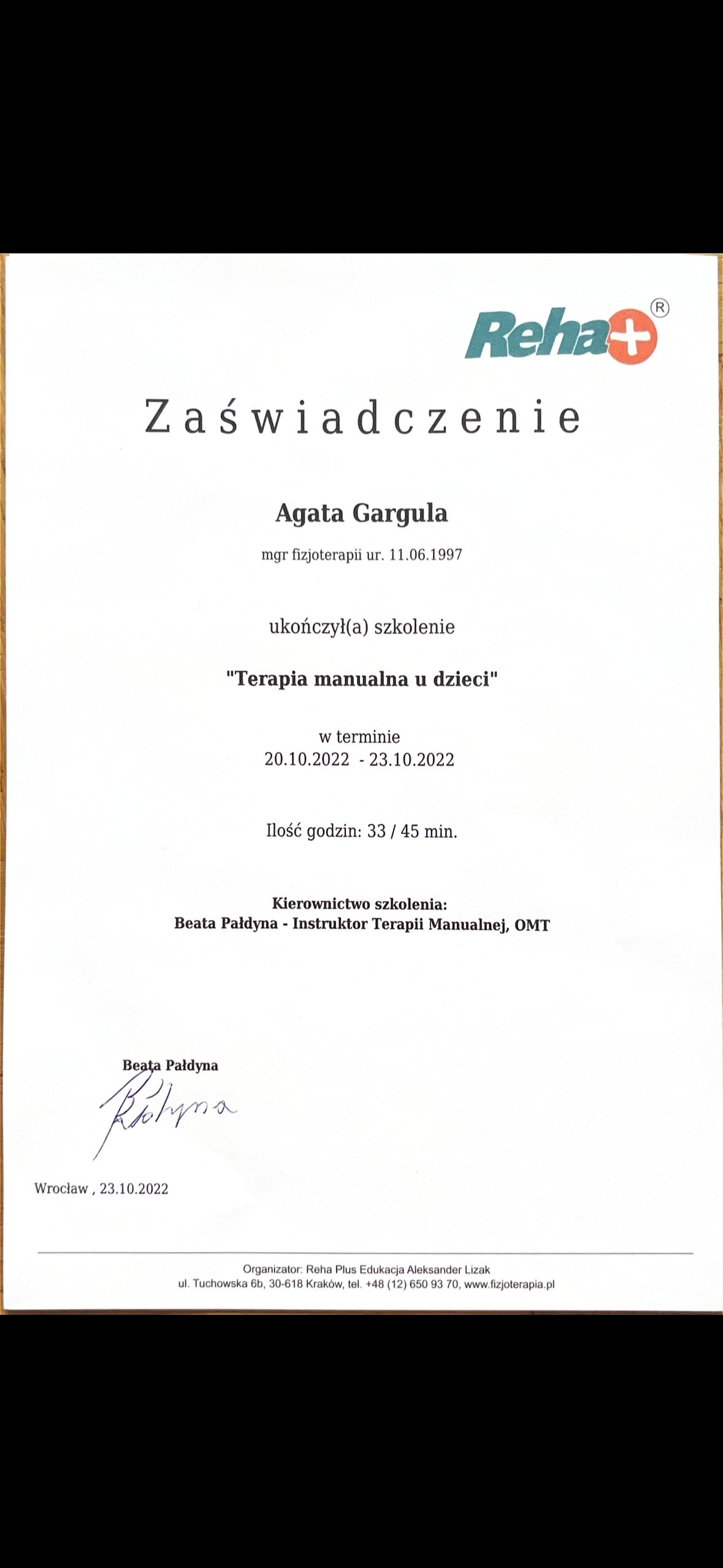 Jaki jest zakres porad oferowanych przez Agata Indyk?Agata Indyk to fizjoterapeuta. Na podstawie swojego doświadczenia i wykształcenia Agata Indyk oferuje usługi takie jak: fizjoterapia dzieci, Fizjoterapia pourazowa, fizjoterapia, Masaż całkowity – 60 min, masaż częściowy.