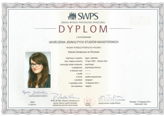 Jestem psychologiem i psychoterapeutką integracyjną po 4-letnim szkoleniu w Instytucie Psychologii Zdrowia Polskiego Towarzystwa Psychologicznego. Studia magisterskie z psychologii ukończyłam z wyróżnieniem na Uniwersytecie SWPS. Doświadczenie zdobywałam pracując jako psycholog na Oddziale Psychiatrycznym Dziennym w Powiatowym Szpitalu Specjalistycznym w Stalowej Woli, podczas stażu w Dziennym Ośrodku Psychiatrii i Zaburzeń Mowy dla Dzieci i Młodzieży we Wrocławiu oraz podczas praktyk na Oddziale Psychiatrycznym Dziennym Dolnośląskiego Centrum Zdrowia Psychicznego we Wrocławiu. Pracowałam jako wykładowca w Akademii Muzycznej im. K. Lipińskiego we Wrocławiu, prowadząc zajęcia z psychologii muzyki w ramach Studium Pedagogicznego. Muzyka jest moją pasją i chętnie włączam ją do pracy terapeutycznej z osobami, które są tym zainteresowane. Regularnie podnoszę swoje kwalifikacje uczestnicząc w szkoleniach, kursach i warsztatach z zakresu psychoterapii, pomocy psychologicznej i metod pracy z ciałem. Moja droga kształcenia zaprowadziła mnie również na kurs terapii akceptacji i zaangażowania (ACT). Pracuję zgodnie z Kodeksem Etyczno-Zawodowym Psychologa. Pracuję w nurcie integracyjnym – indywidualnie podchodząc do każdej osoby, korzystam z dorobku różnych szkół terapeutycznych. Szczególne znaczenie ma dla mnie jakość relacji terapeutycznej. Kierując się empatyczną, nieoceniającą i pełną szacunku postawą, staram się stworzyć bezpieczną przestrzeń dla osoby, z którą pracuję. Pracuję z osobami dorosłymi.