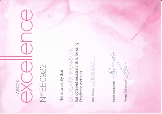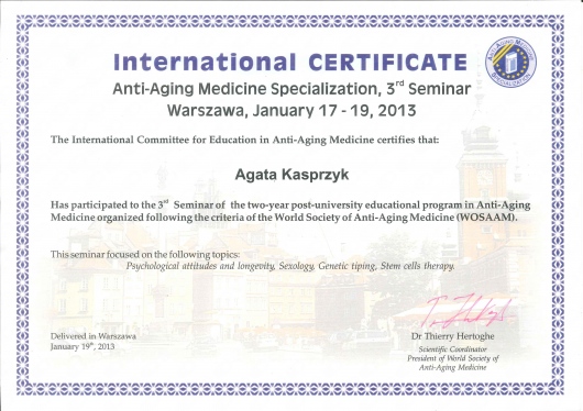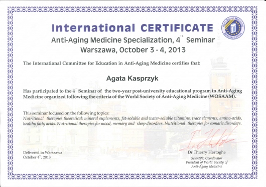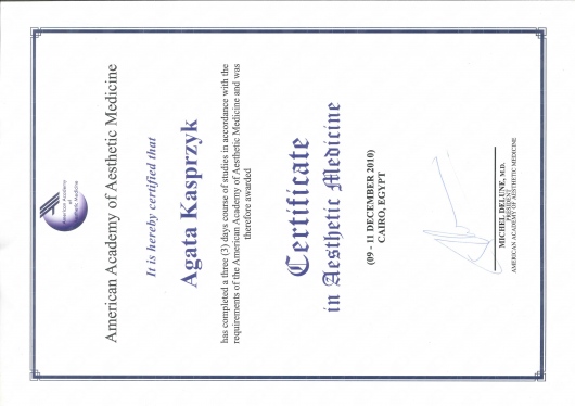Uczestniczyła m.in. w 2-letnim Międzynarodowym Studium Podyplomowym Medycyny Przeciwstarzeniowej (WOSAAM-Worlod Societyty od Antiaging Medicine), odbyła staż w Brazylii, 3 miesięczny staż w ramach specjalizacji w Oddziale Chirurgii Plastycznej Szpitala im. Marciniaka oraz uczestniczyła w licznych szkoleniach i kongresach w kraju i za granicą (Kair, Chiny, USA, Włochy, Francja, Wielka Brytania).