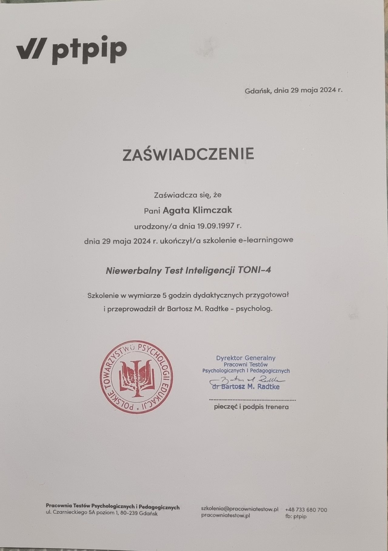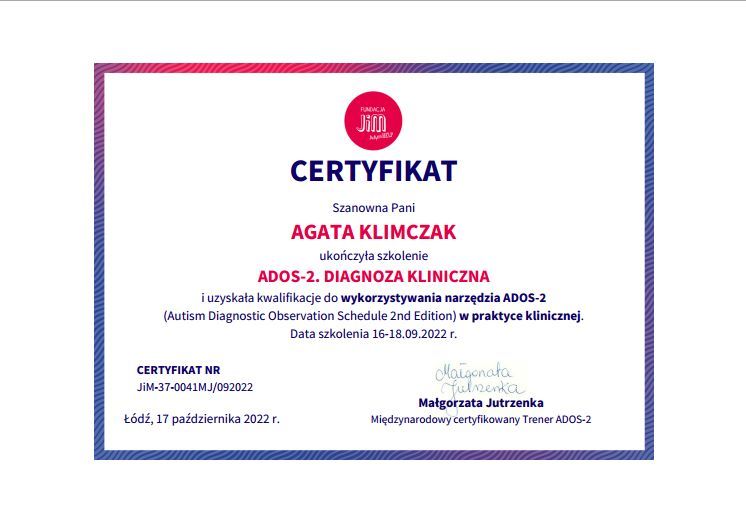 Posiadam uprawnienia do posługiwania się narzędziami takimi jak ADOS-2, Skala Inteligencji Stanford-Binet 5, Niewerbalny Test Inteligencji TONI-4.