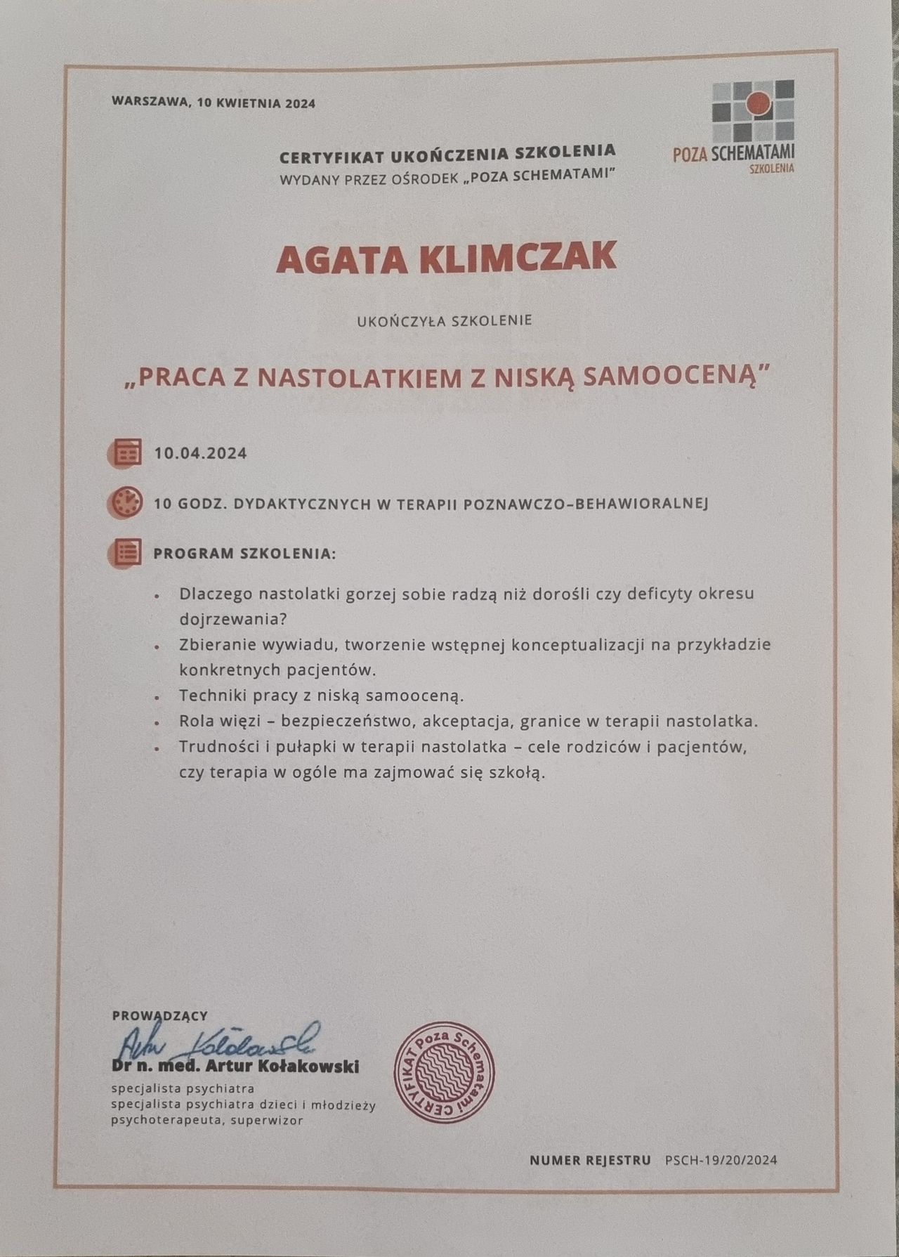 Ukończyłam wiele szkoleń, które pomagają mi w jak najlepszy sposób zaopiekować się moim pacjentem m. in. Terapia poznawczo-behawioralna Dzieci i Młodzieży. Obecnie jestem w trakcie szkolenia TSR - Terapia Skoncentrowana na Rozwiązaniu.