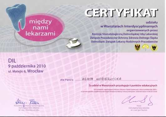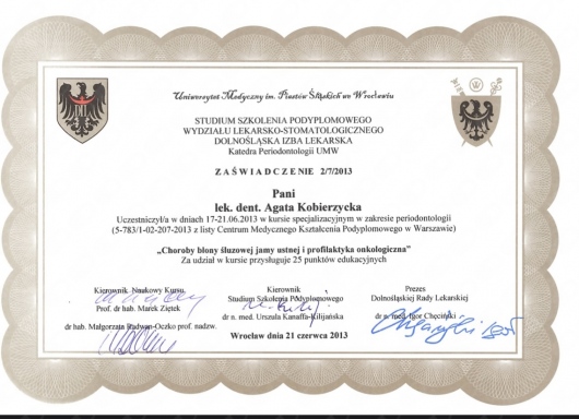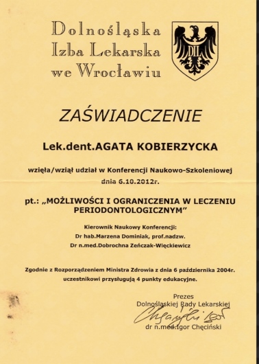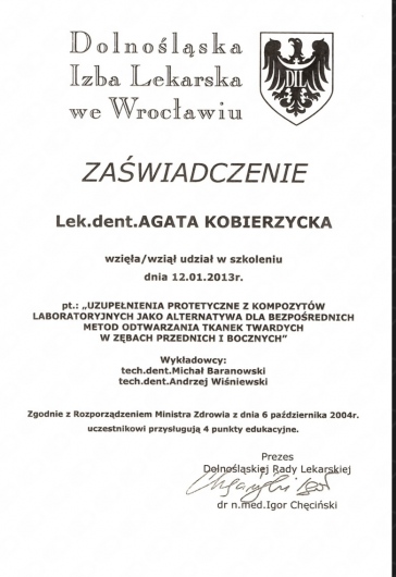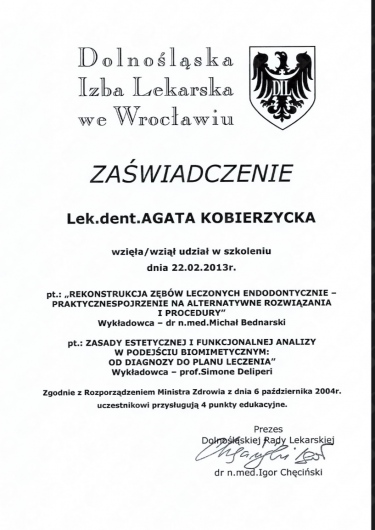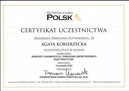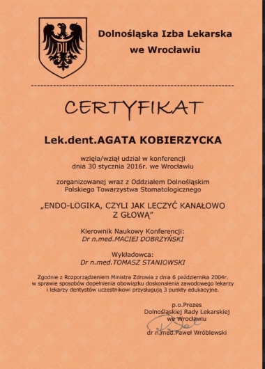 Polecam Panią dr Agatę Kobierzycka z całego serca. Szczególnie osobom, które odczuwają lęk przed wizytą u stomatologa. Pani doktor jest bardzo delikatna,dokładna, perfekcyjna. Przy tym bardzo miła, empatyczna i komunikatywna. Wizyty u Pani doktor A Kobierzyckiej to czysta przyjemność.
