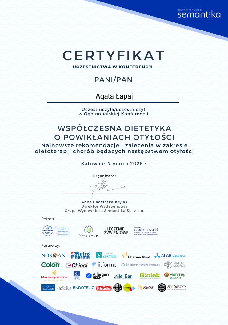 Jaki jest zakres porad oferowanych przez Agata Łapaj?Agata Łapaj to dietetyk. Na podstawie swojego doświadczenia i wykształcenia Agata Łapaj oferuje usługi takie jak: Konsultacja dietetyczna, konsultacja dietetyczna + jadłospis 14-dniowy, Konsultacja dietetyczna + 7 dniowy jadłospis, konsultacja online.