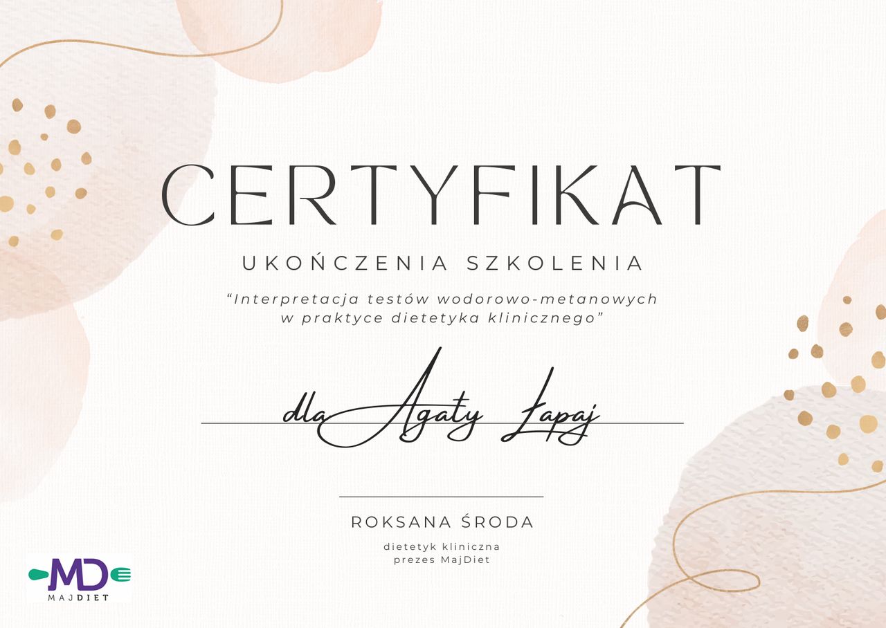 Jestem bardzo zadowolona z wizyt u pani Agaty. Zawsze podchodzi z empatią do pacjenta, wszystko dokładnie wytłumaczy, pomaga w znalezieniu ścieżki do rozwiązywania błędów dietetycznych. Jestem bardzo zadowolona z diety, którą otrzymałam. Jest konkretnie rozpisany rozkład kaloryczny każdego posiłku i składniki odżywcze. Każdy posiłek jest dopasowany do moich preferencji żywieniowych i zawiera moje ulubione potrawy.